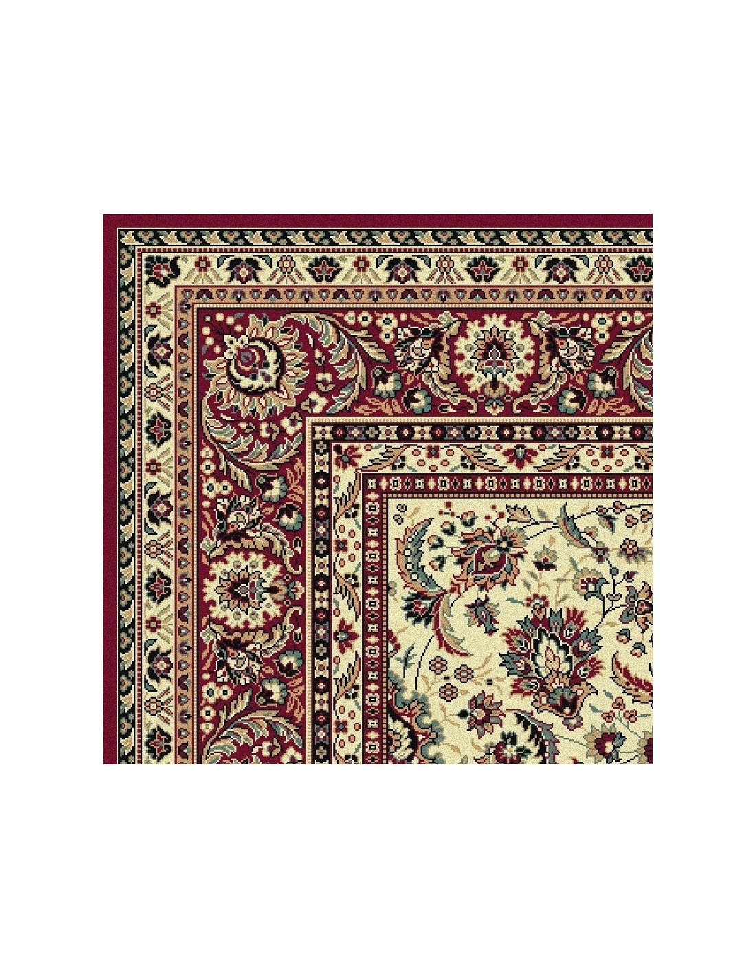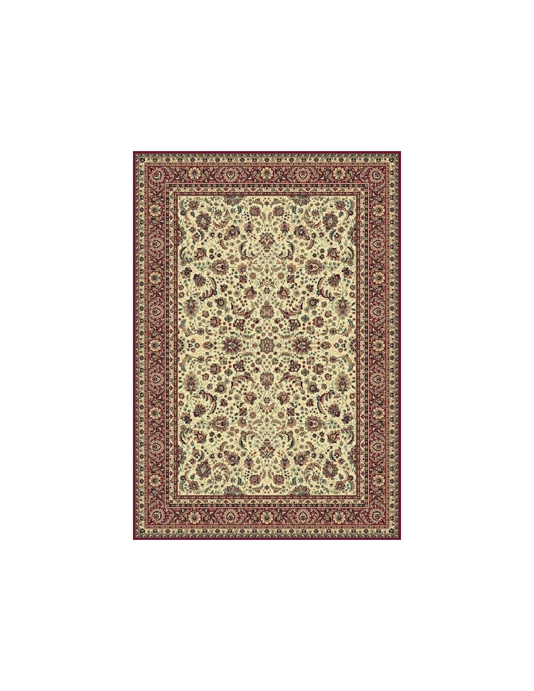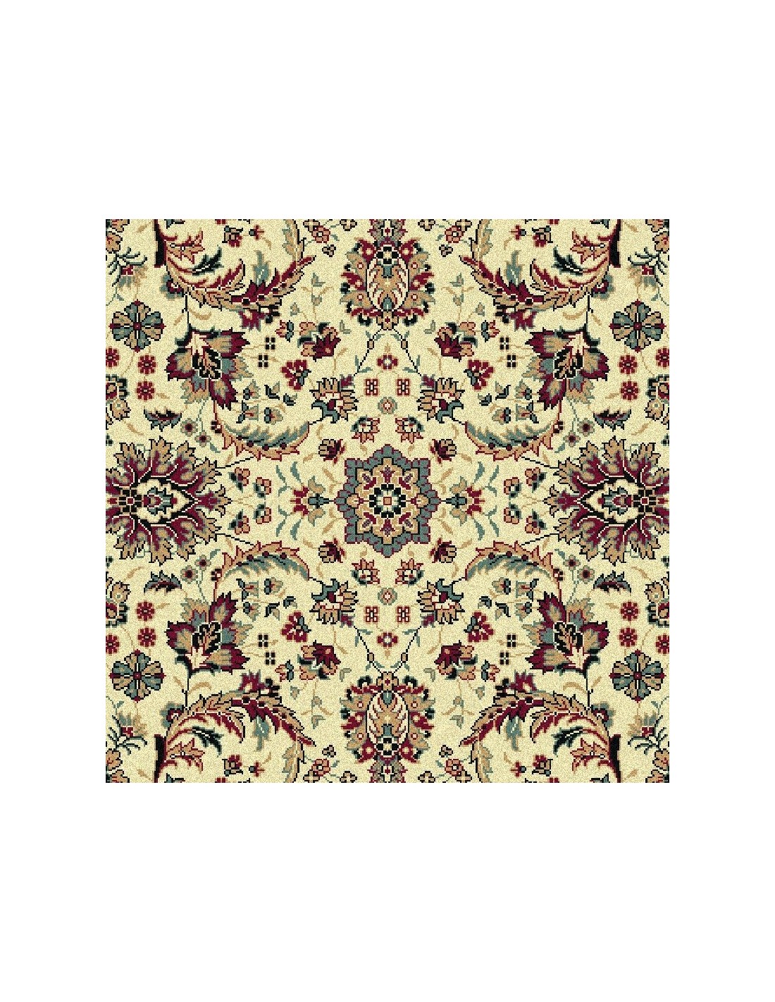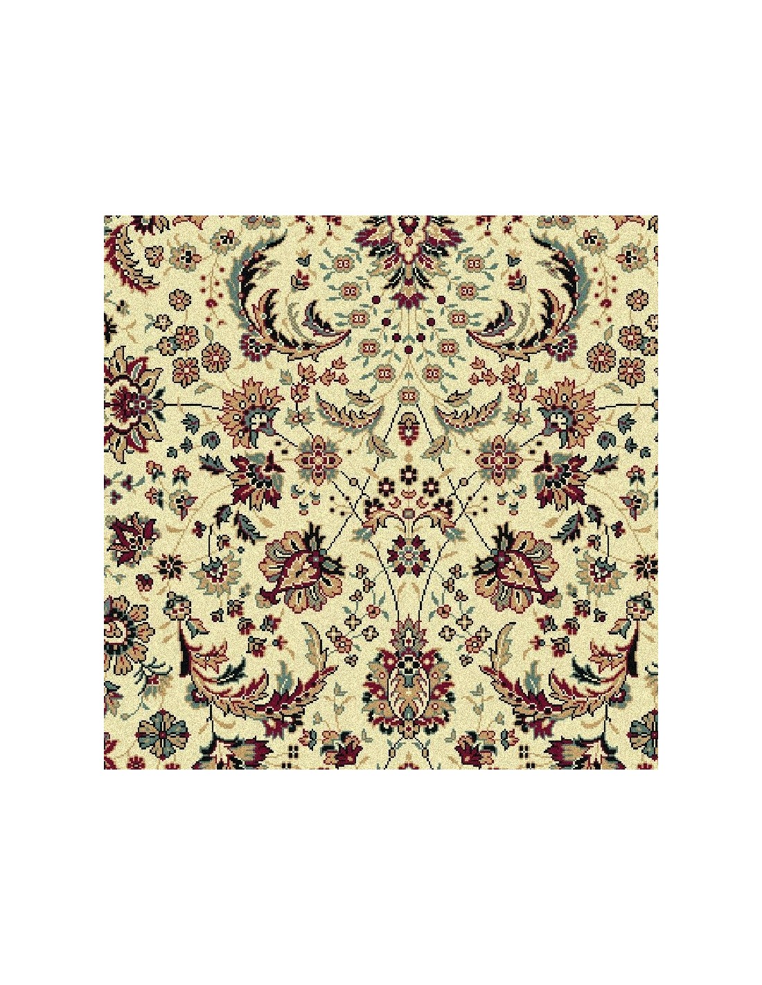 Leggerezza e raffinatezza contraddistinguono questo Carpet classico. L'elegante sfondo crema fa risaltare la bellezza dei dettagli floreali, impreziositi da un uso sapiente dei colori. Rosso cremisi, rosso mattone, rosa, verde oliva, azzurro, turchese, giallo si intrecciano seguendo le delicate linee dei virgulti del motivo floreale. L'assenza del medaglione centrale viene compensata dal fiore centrale racchiuso all'interno di un rombo circondato da foglie di acanto. Arabeschi e viticci si diramano dall'elemento centrale per tutta l'ampiezza del campo. Un Carpet splendido e di classe, perfetto per chi ama lo stile classico senza rinunciare alla freschezza. Disponibile in un'ampia gamma di misure, anche passatoia e rotondo, questo Carpet coronerà il vostro arredamento, garantendo al contempo semplicità nella manutenzione e resistenza.