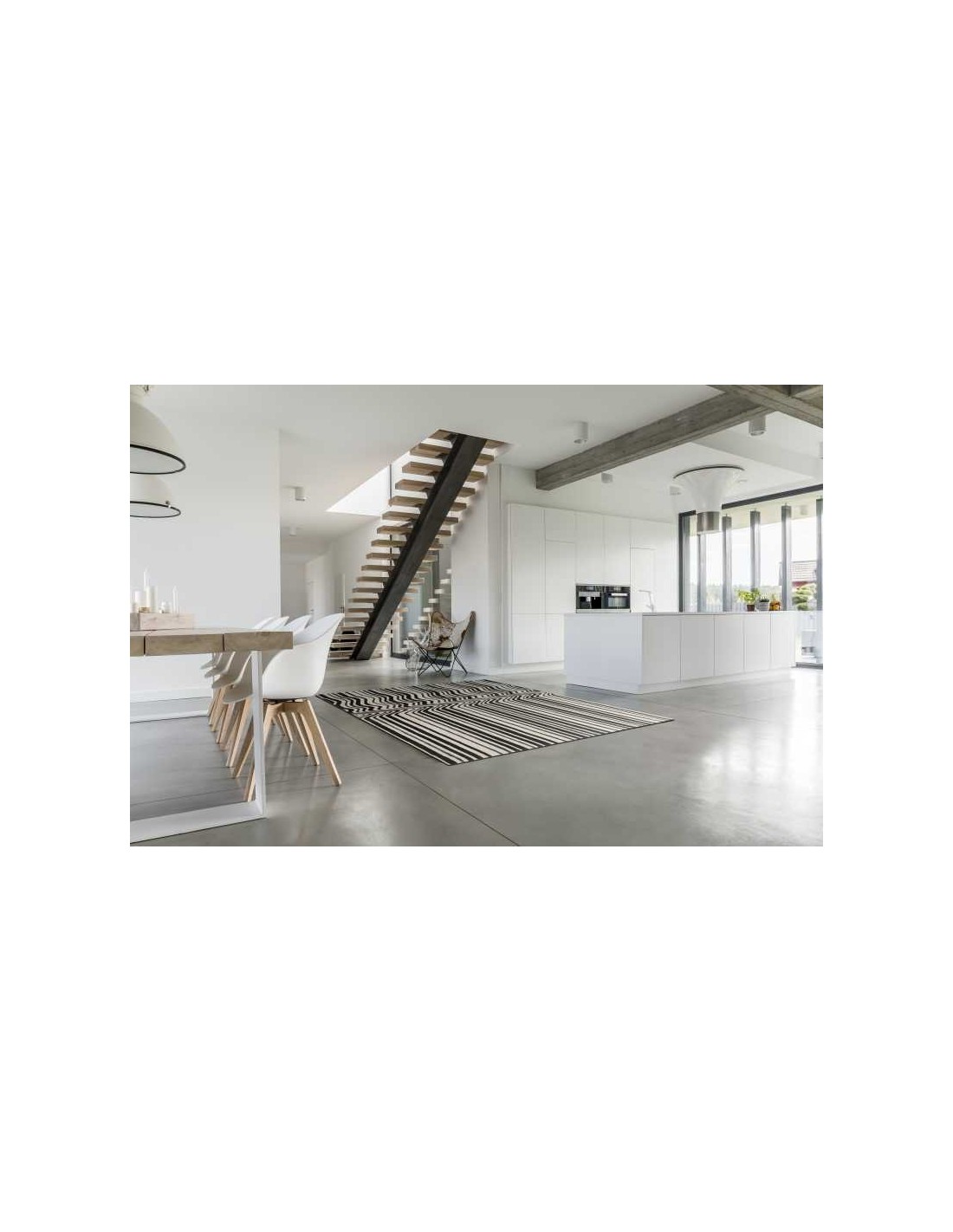 The color palette of the Alto Blue is both bold and calming, with a dominant deep blue hue that evokes the serenity of the evening sky. This is beautifully contrasted by crisp white lines that frame the rug, creating a clean and contemporary border that accentuates its modern aesthetic.