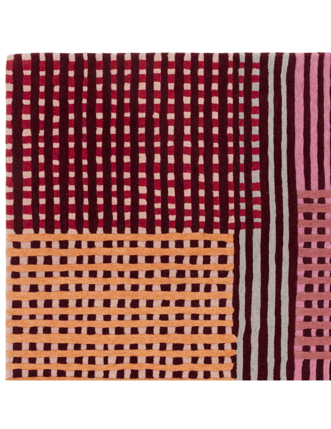Brighten your space with the Aspect Red Multi rug, a vibrant blend of reds, pinks, purples, and soft oranges arranged in bold geometric stripes. This modern designer rug showcases a dynamic patchwork of vertical and horizontal lines, creating a lively yet balanced look. Crafted from natural wool with a plush 9 cm pile, it offers both comfort and durability. Perfect for adding warmth and style to any room, its striking pattern complements minimalist and eclectic interiors alike, making it a standout piece that effortlessly enhances your décor.