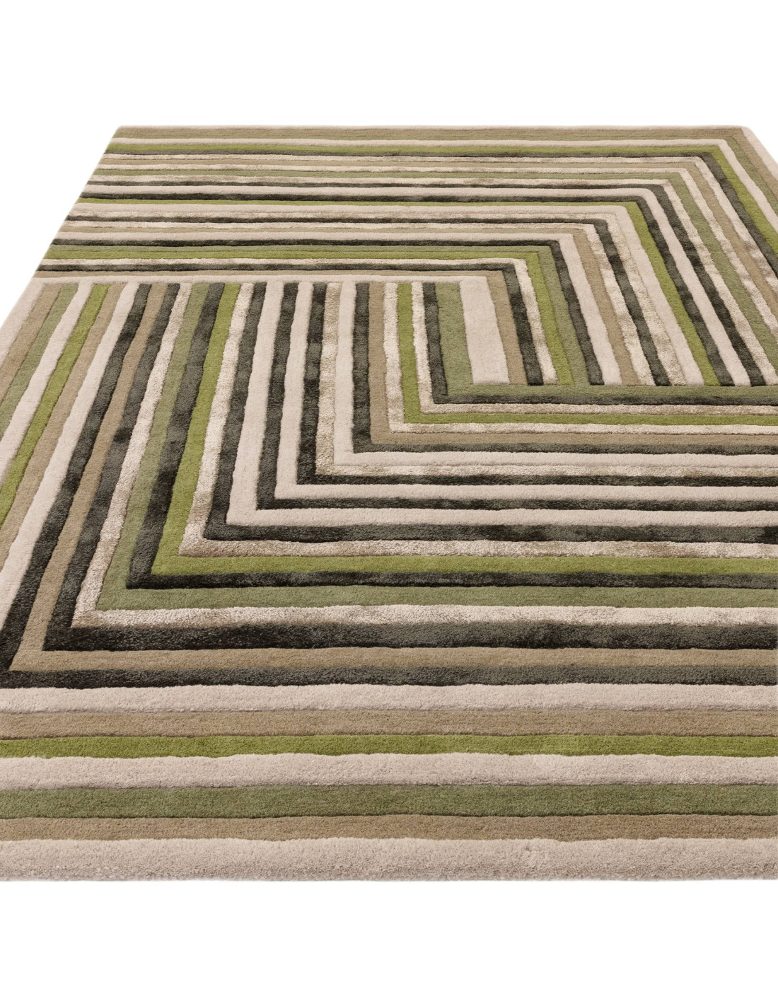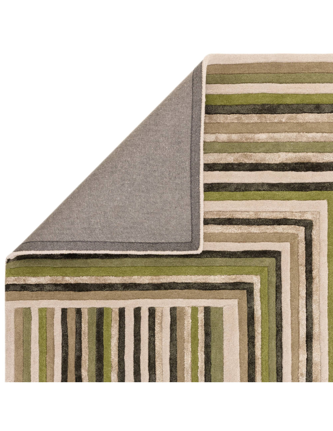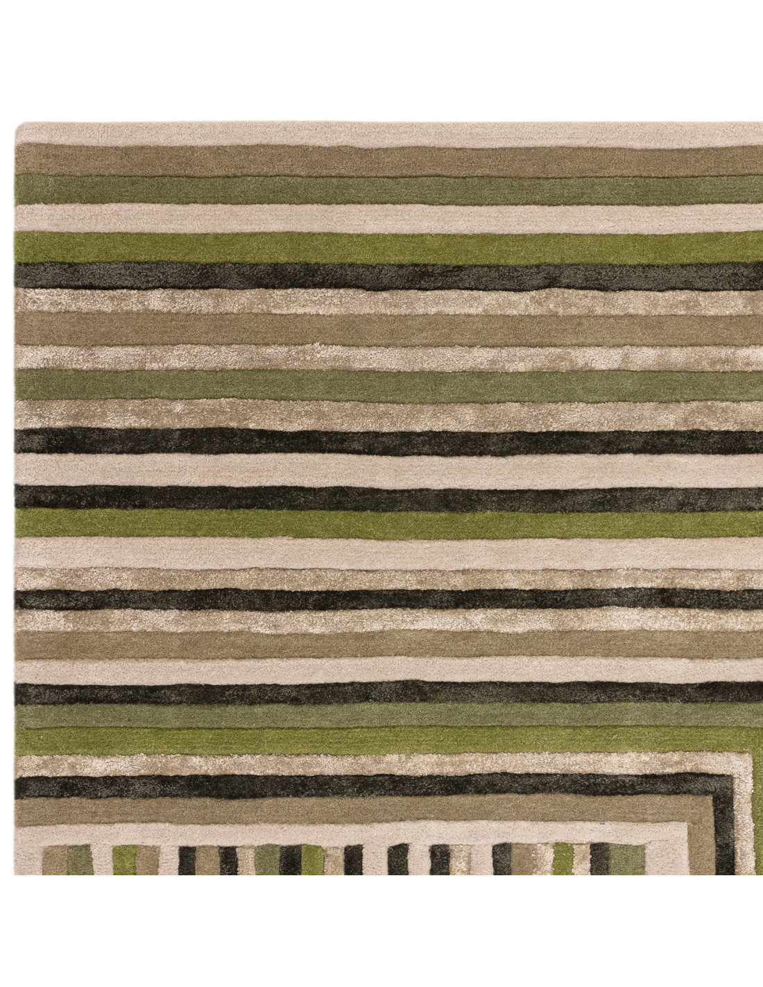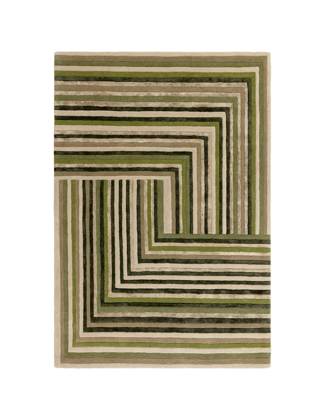 Elevate your living space with the Matrix Network Forest rug, a stunning example of modern designer rugs that effortlessly blends style and comfort. This exquisite piece features a captivating geometric pattern, where parallel lines in varying shades of green and earthy beige create a dynamic, layered effect. The design draws the eye inward with its clever use of right angles and alternating stripes, making it a perfect centerpiece for contemporary interiors.