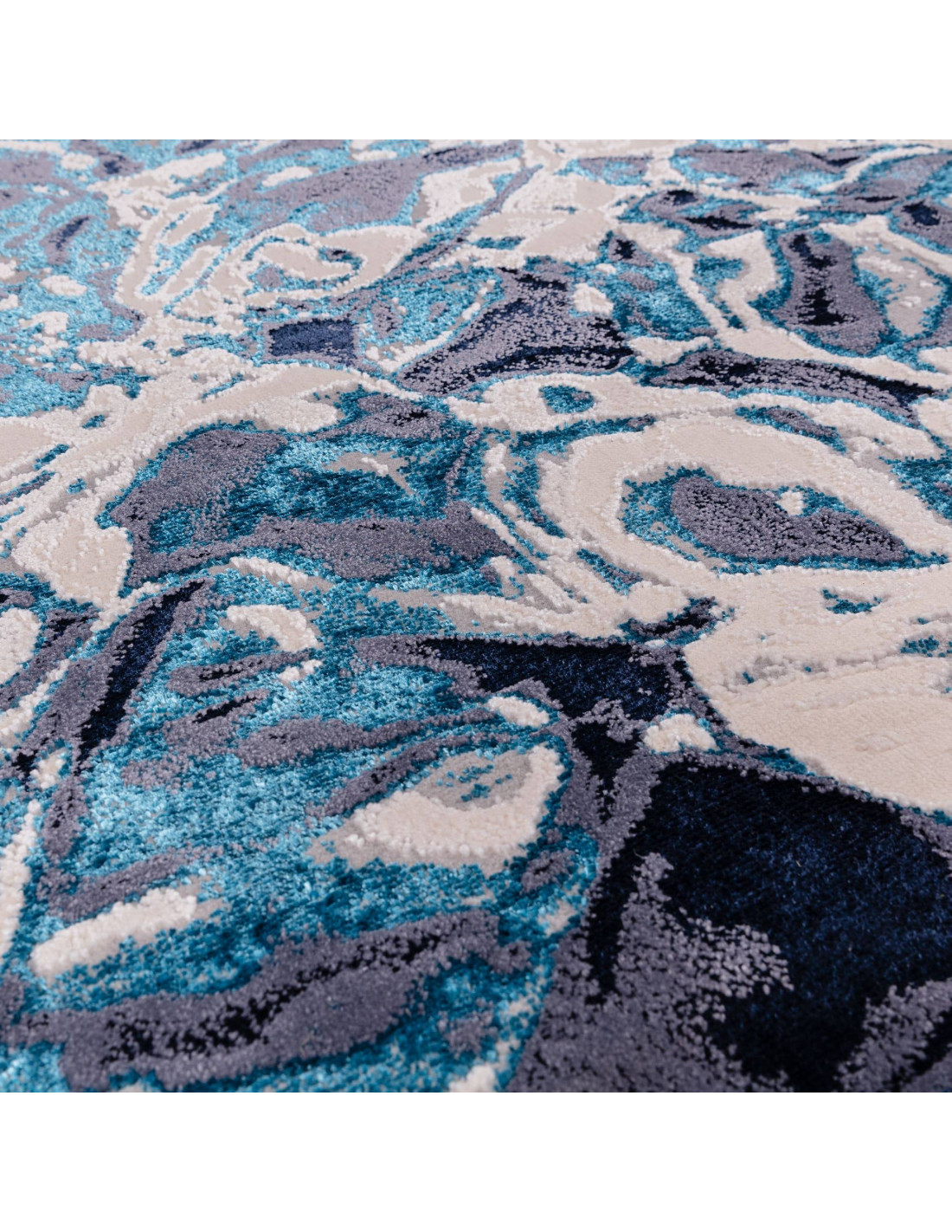 Elevate your space with the Aurora Foam AU21, a modern luxury rug featuring an abstract fantasy design inspired by swirling water and clouds. Its rich palette of deep navy, soft cream, and teal blue creates a captivating visual flow that adds depth and movement to any room. The silk look finish gives the rug a subtle shine, enhancing its luxurious appeal. Perfect for adding a sophisticated touch to living rooms, bedrooms, or dining areas, this rug combines artistic elegance with practical durability for everyday comfort and style.