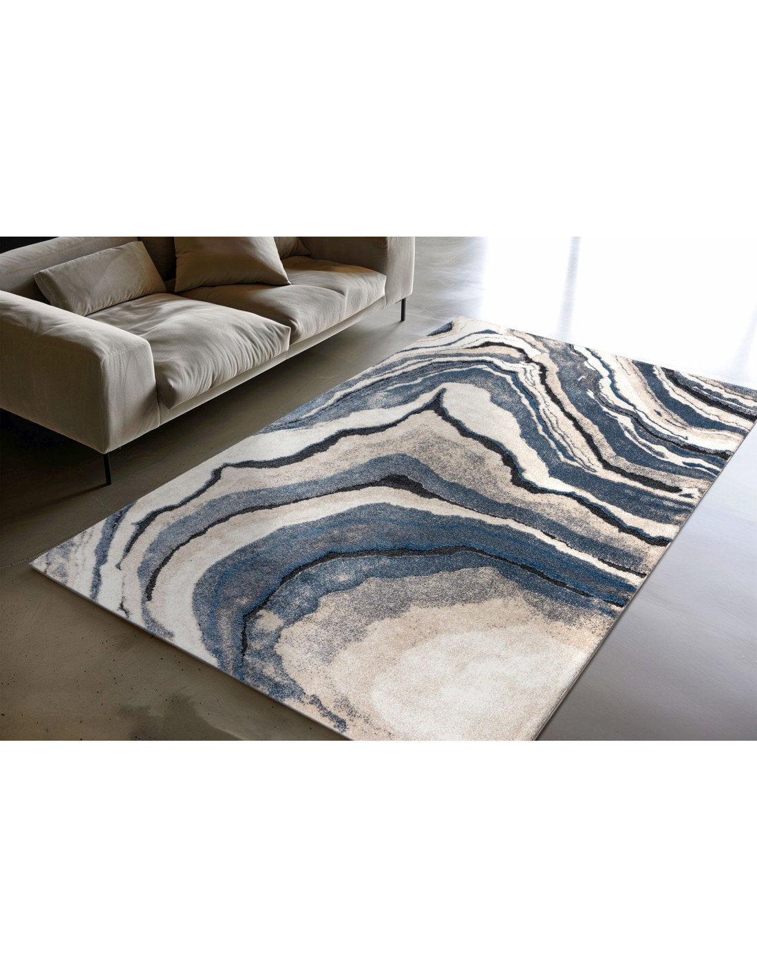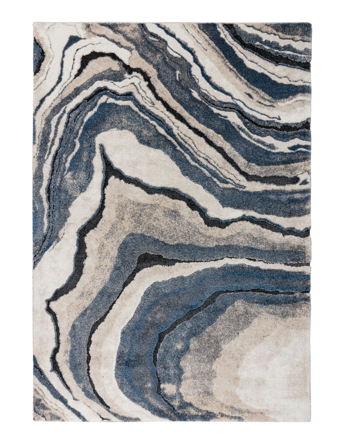 Transform your living space with the captivating Bologna 461 Blue rug, a true masterpiece of modern design and craftsmanship. This exquisite carpet features a mesmerizing fantasy-inspired pattern that mimics the natural flow and organic beauty of agate stone formations. Swirling layers of deep blue, soft beige, charcoal, and creamy white blend seamlessly to create a dynamic visual effect that draws the eye and adds depth to any room.