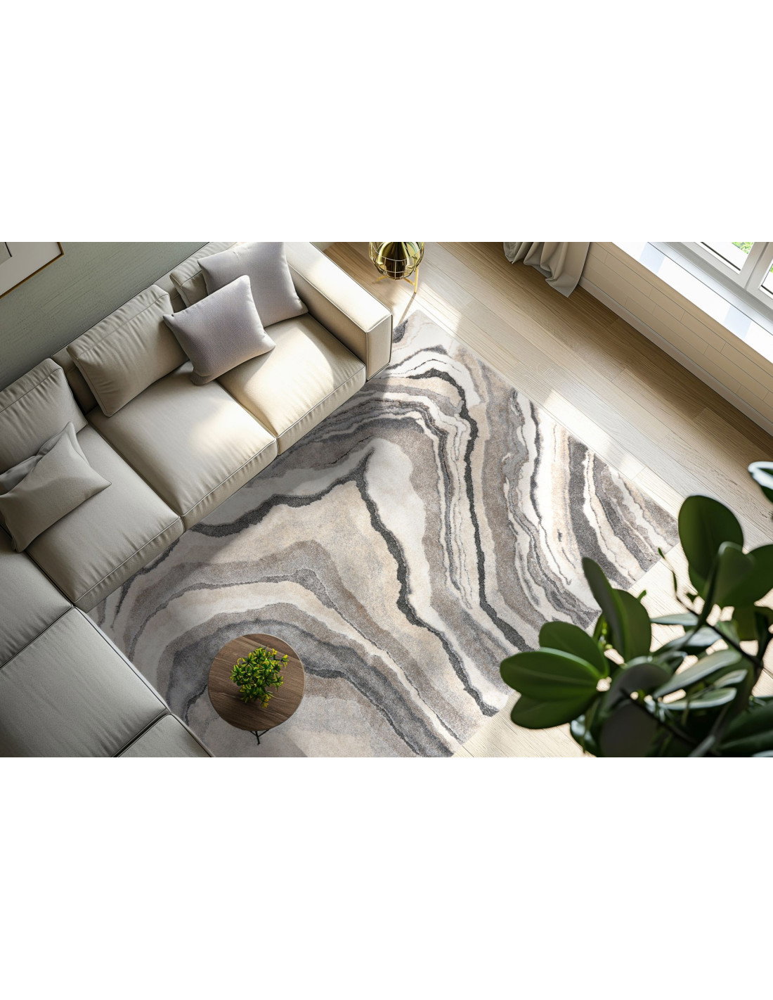 Transform your living space with the captivating elegance of the Bologna 461 Grey rug, a stunning piece that effortlessly blends modern artistry with practical design. This rug features a mesmerizing fantasy pattern that mimics the natural flow and layered texture of geological formations, creating a dynamic visual effect that draws the eye and adds depth to any room. The swirling bands of grey, beige, and soft taupe tones are beautifully balanced with darker charcoal accents, offering a sophisticated neutral palette that complements a wide range of interior styles.