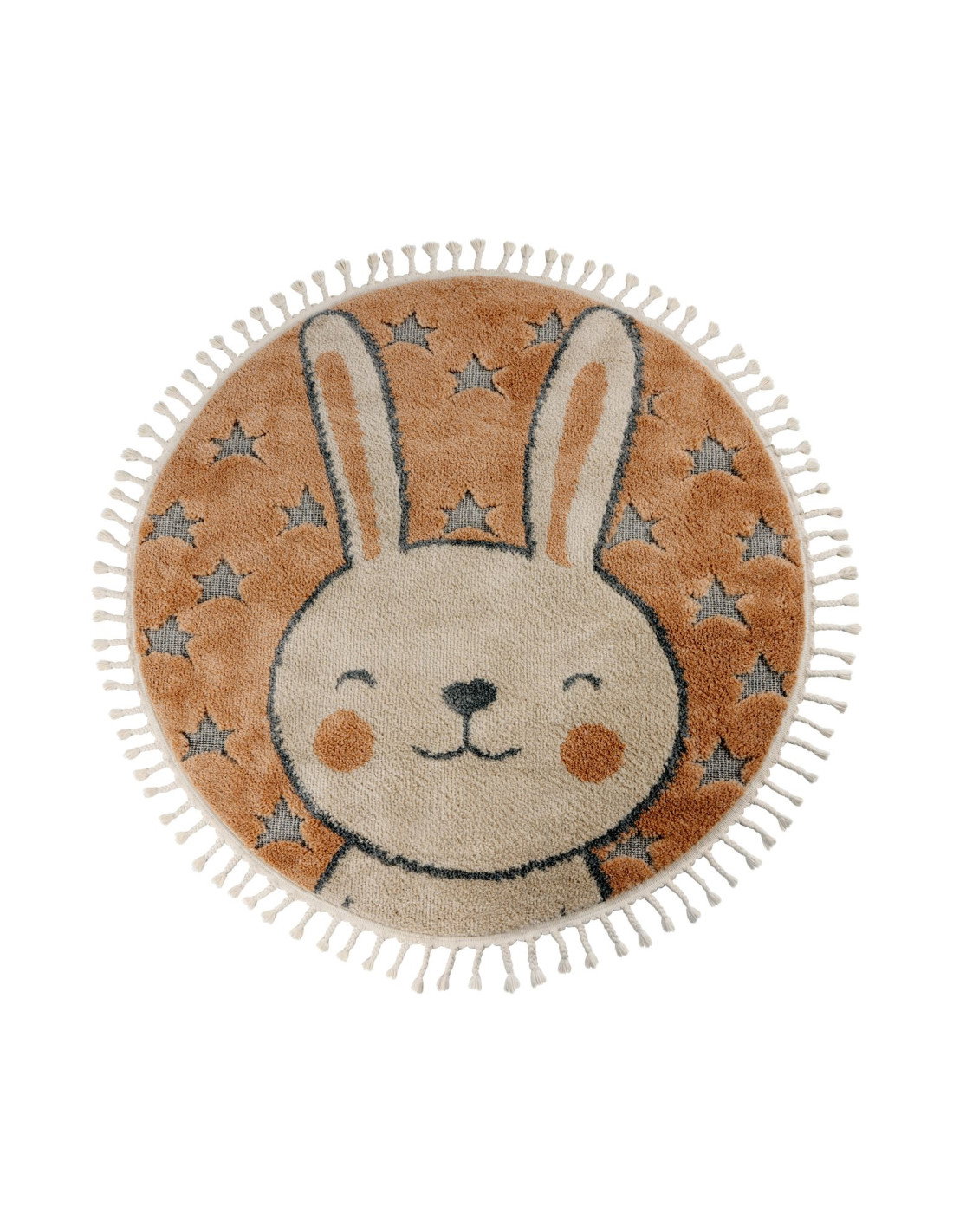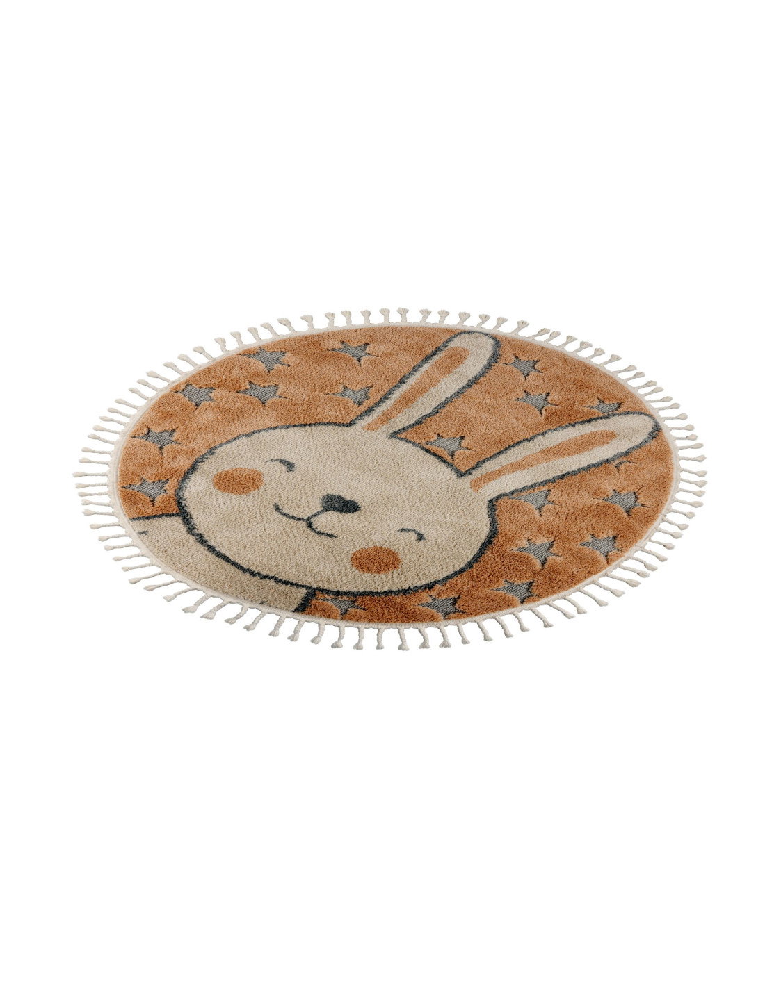 Bring a touch of warmth and whimsy to your child's room with the delightful Fano 390 rabb rug. This round carpet features an adorable bunny face at its center, instantly creating a cozy and inviting atmosphere. The bunny’s soft beige face, accented with gentle blush cheeks and outlined in a subtle charcoal gray, exudes a friendly and comforting vibe. Surrounding the bunny is a warm, earthy terracotta background adorned with playful star cutouts, adding a magical and dreamy element to the design. The rug’s fringed edges enhance its handcrafted feel, making it a perfect blend of fun and sophistication for any modern nursery or playroom.