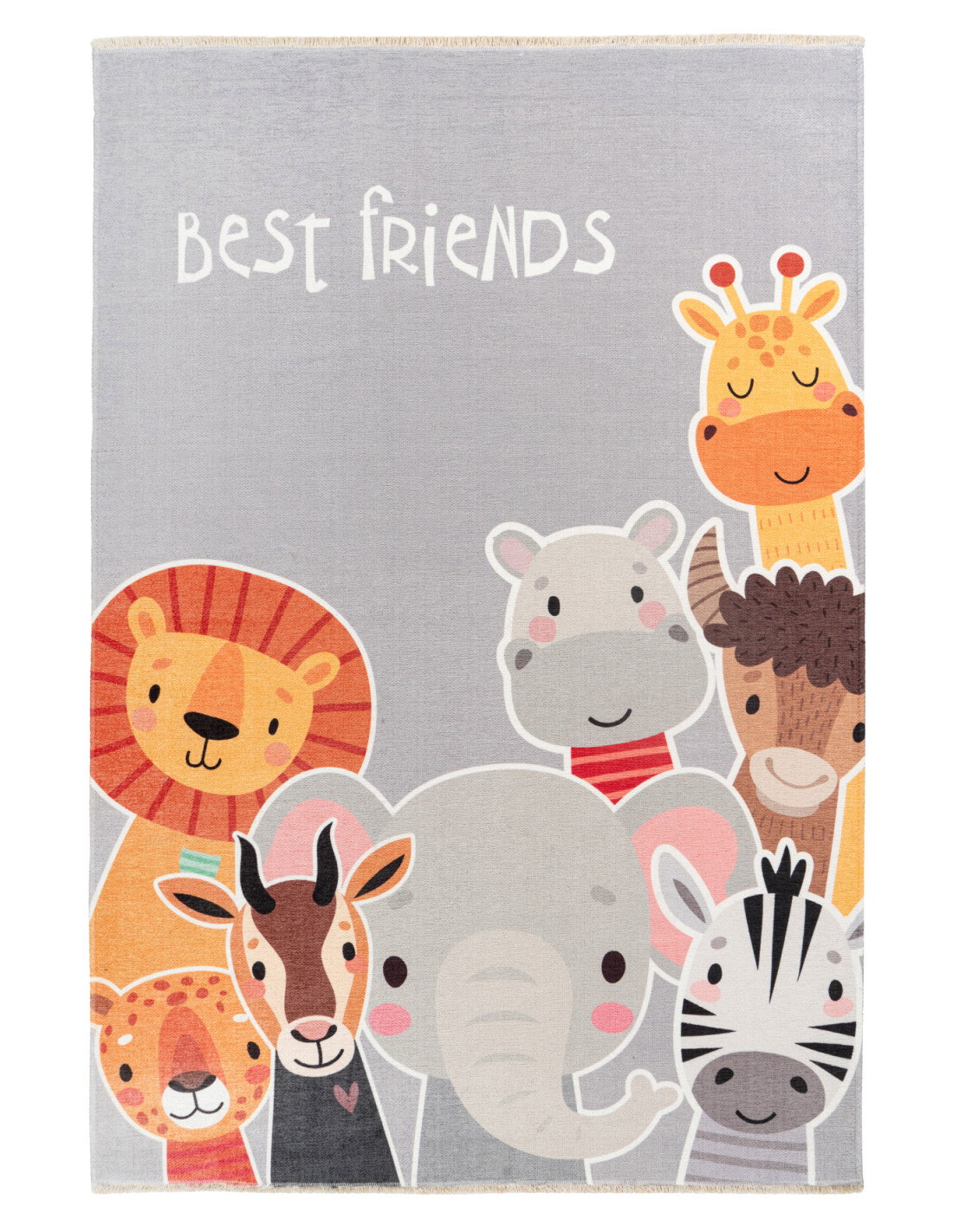 The design is crafted with a modern, cartoon-like aesthetic that appeals to children and parents alike, making it an ideal choice for nurseries, playrooms, or bedrooms. The animals’ sweet expressions and soft blush accents evoke a sense of friendship and comfort, perfectly capturing the “best friends” theme displayed on the rug. This playful pattern not only adds visual interest but also encourages imaginative play and storytelling, making it a functional and decorative addition to your home.