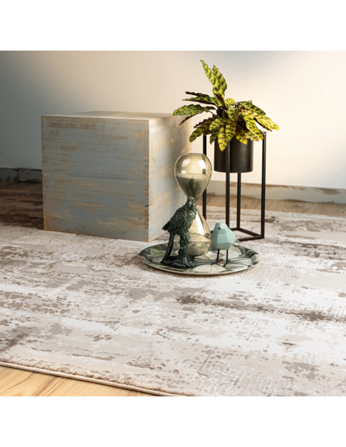 The design of this rug is truly a visual delight. Its abstract pattern mimics the natural flow of weathered surfaces and organic textures, giving it a unique character that feels both artistic and timeless. The subtle interplay of light and dark taupe shades creates depth and movement, ensuring the rug becomes a focal point without overwhelming your décor. Whether placed under a coffee table, in a bedroom, or as an accent in a hallway, this rug brings a refined elegance that complements your home effortlessly.