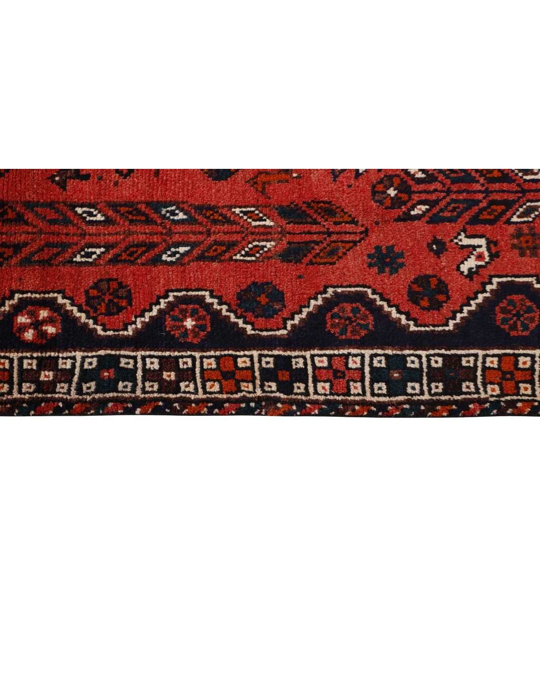Characterized by a deep claret color combined with dark blue and small areas of white and green, Shiraz rugs emanate a sense of warmth and richness. The wool used in these rugs is exceptionally soft, and in some cases, a blend of darker wool and goat's hair is employed for both the warp and weft. The patterns are coarse and geometric, frequently resembling the distinctive Kashghai patterns. Delightful motifs of small, geometric birds and animals often adorn these rugs, adding a touch of vibrancy. Shiraz rugs are available in various sizes, although larger rugs are relatively rare.