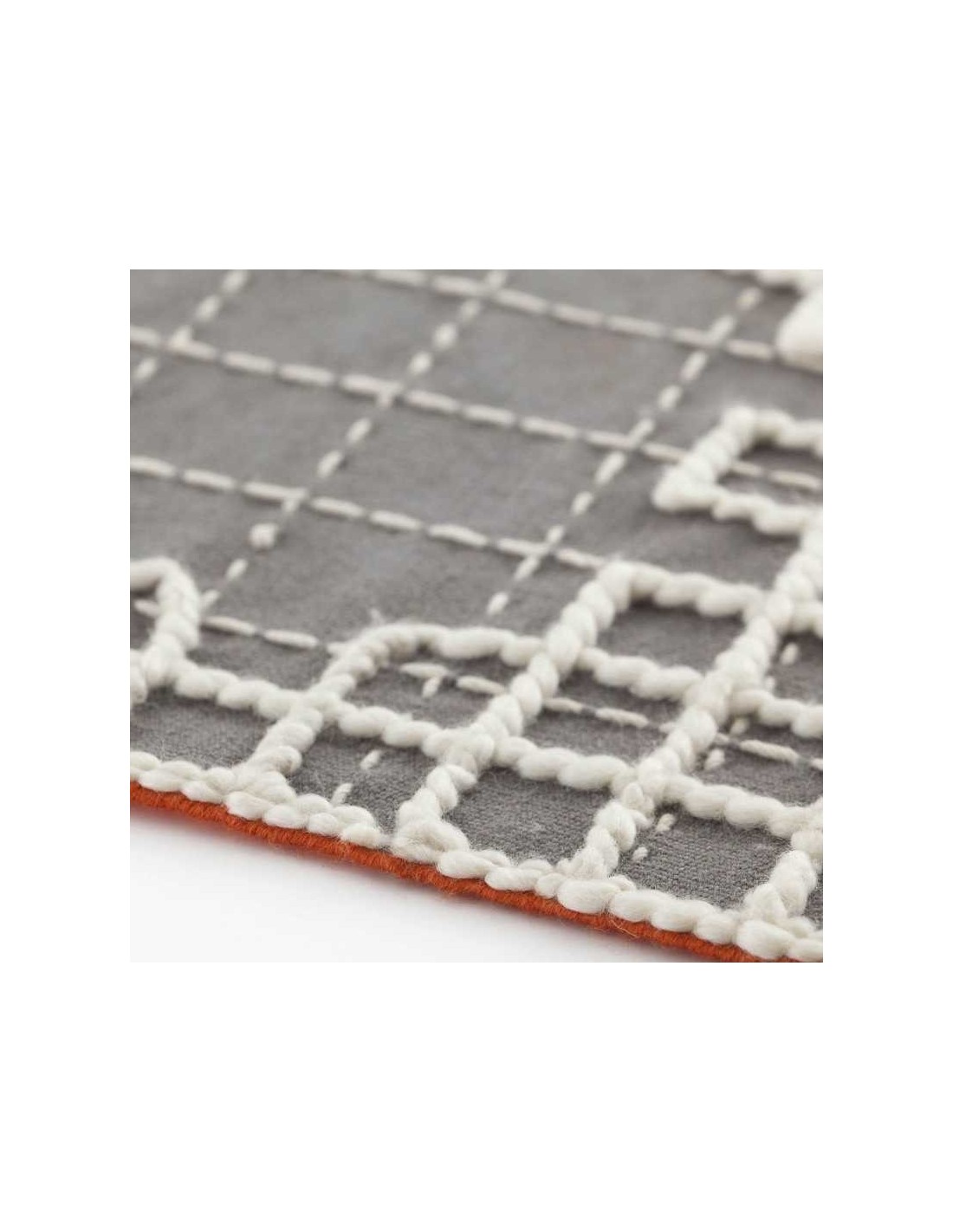 This is the A grey individual rug, one of the ten runners that make up the Bandas collection. Its design, apparently random, is embroidered using white wool of two different thicknesses on a grey base. This embroidery is done by hand with crochet needles. As a small note of color, the piece is accented with an orange border.
