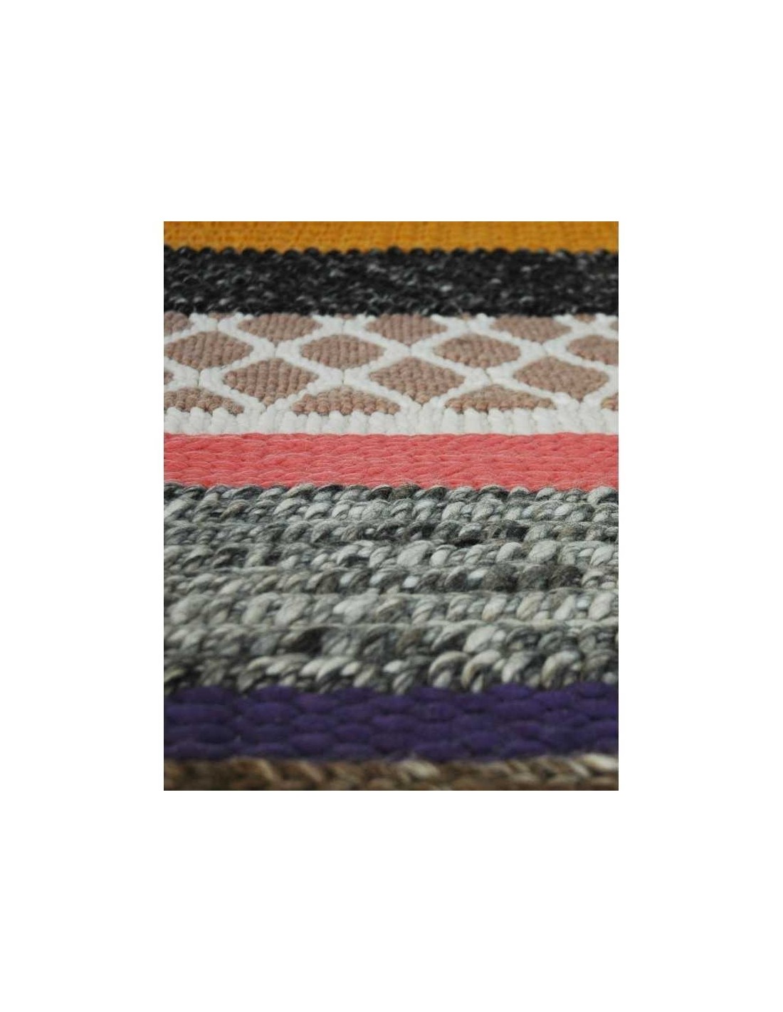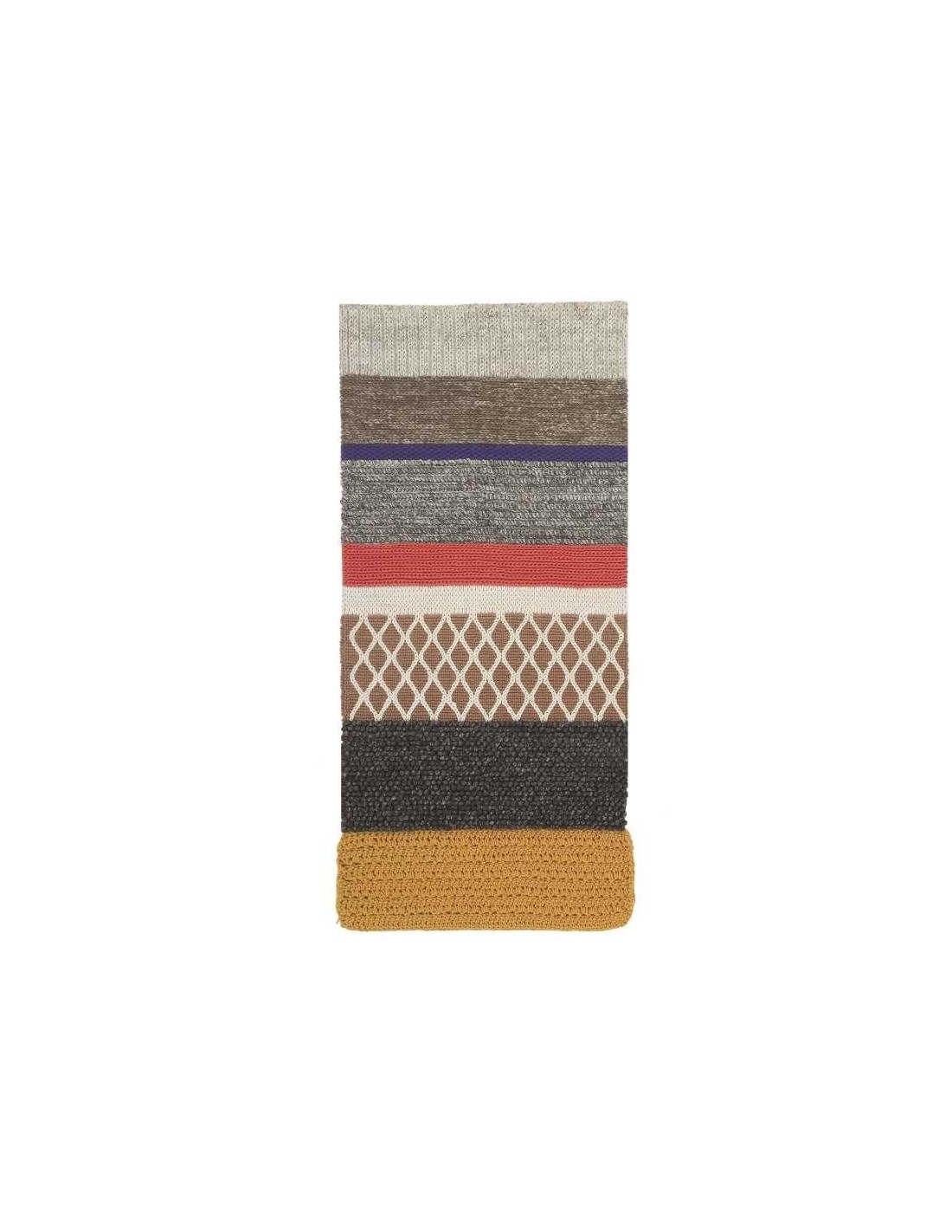This is the rectangular MR2 rug from the Mangas Original collection, a piece that includes nine different textures and designs in alternating stripes. Each one is made with different colors and techniques, this model combines wool threads in neutral tones with certain notes of strawberry, violet and ocher. It is available in two sizes and its structure is rectangular but slightly rounded on one side.