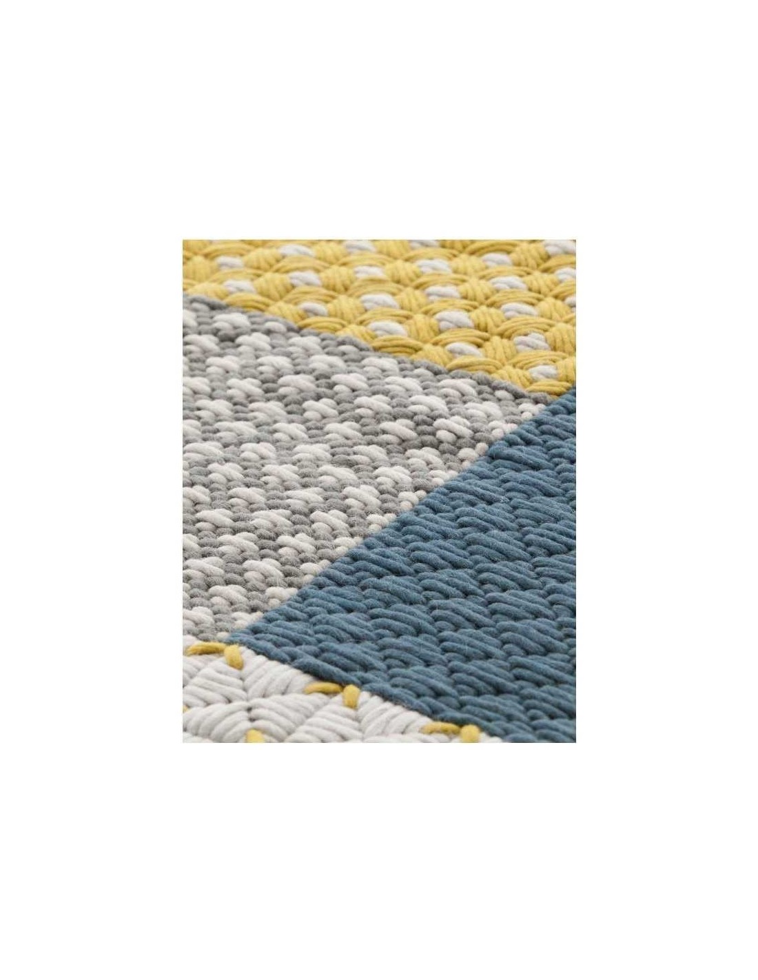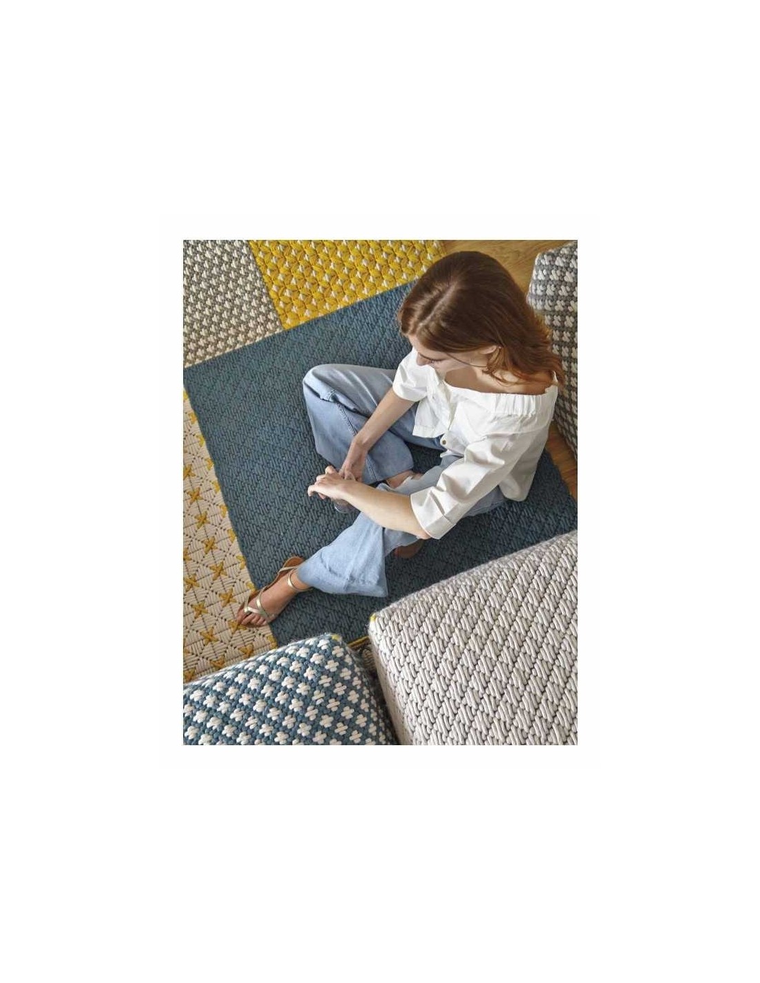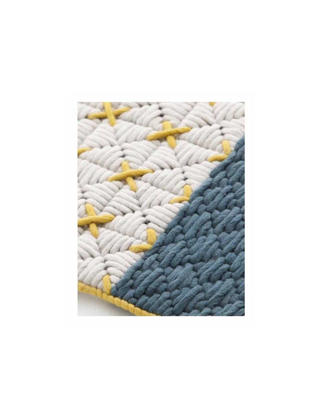 This is the Blue rug from the Silai collection, made with thick wool yarns in an innovative reinterpretation of the petit point technique. Its designer, Charlotte Lancelot, is able to achieve tile-like patterns by using four different stitch lengths. The result is a rug with four distinct designs, as if it were recreating the mismatched floors that can often be found in old houses. Squares, triangles, rhombuses, hexagons, octagons and crosses are all embroidered by hand using only dark blue, white, gray and yellow threads.