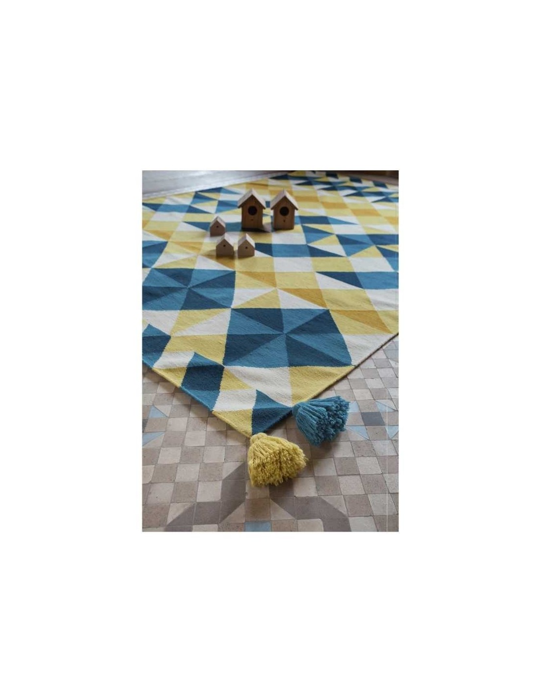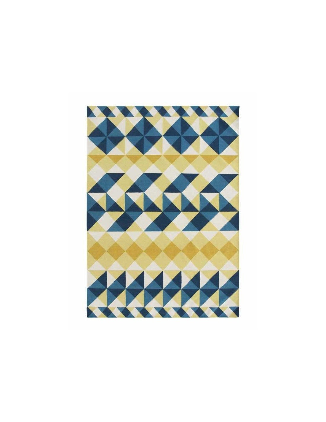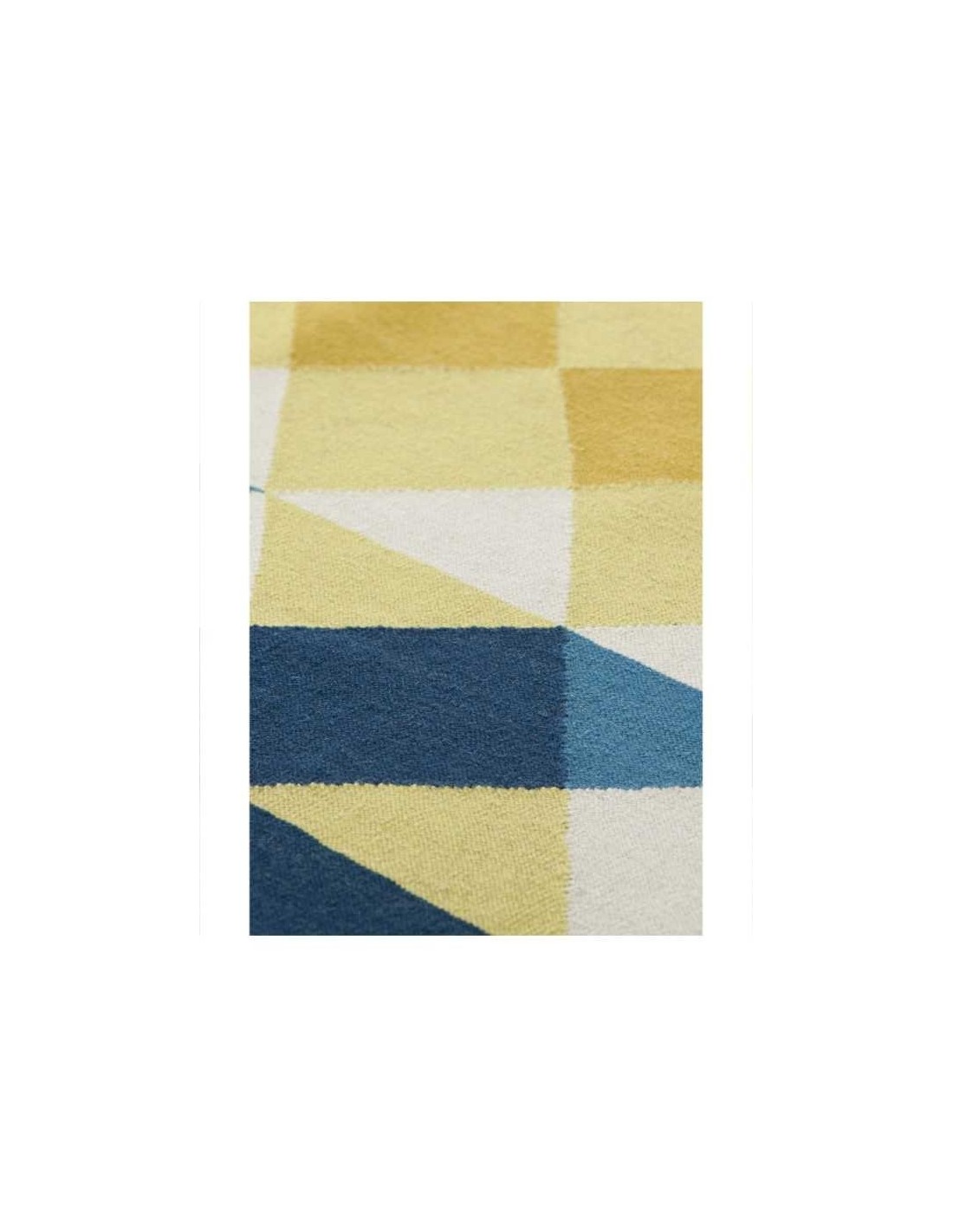Questo è il kilim Mosaie, un design di Javier Tortosa in tonalità gialle e blu che ricorda i mosaici Nolla caratteristici del Mediterraneo spagnolo. Usando piccole forme geometriche come quelle che si trovano su quei pavimenti, Mosaiek lavora specificamente con triangoli, alternando solo tre toni: un bianco rotto, due gialli e due blues. I toni più morbidi producono un effetto grafico interessante, come uno strato con opacità inferiore.