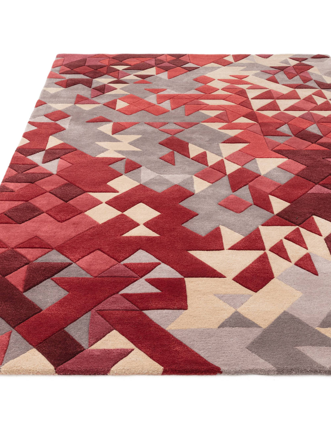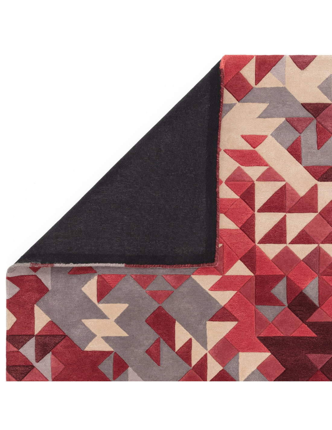Il tappeto Enigma Red Multi si distingue per la sua palette vibrante, che combina il rosso intenso con sfumature di beige e grigio, creando un effetto visivo dinamico e avvolgente. Il design geometrico, fatto di triangoli e forme angolari, dona un tocco moderno e sofisticato, perfetto per chi cerca tappeti moderni design capaci di valorizzare ogni ambiente. La lavorazione artigianale e la texture morbida di lana e viscosa assicurano comfort e resistenza, rendendo questo tappeto un elemento di stile e funzionalità per il soggiorno contemporaneo.