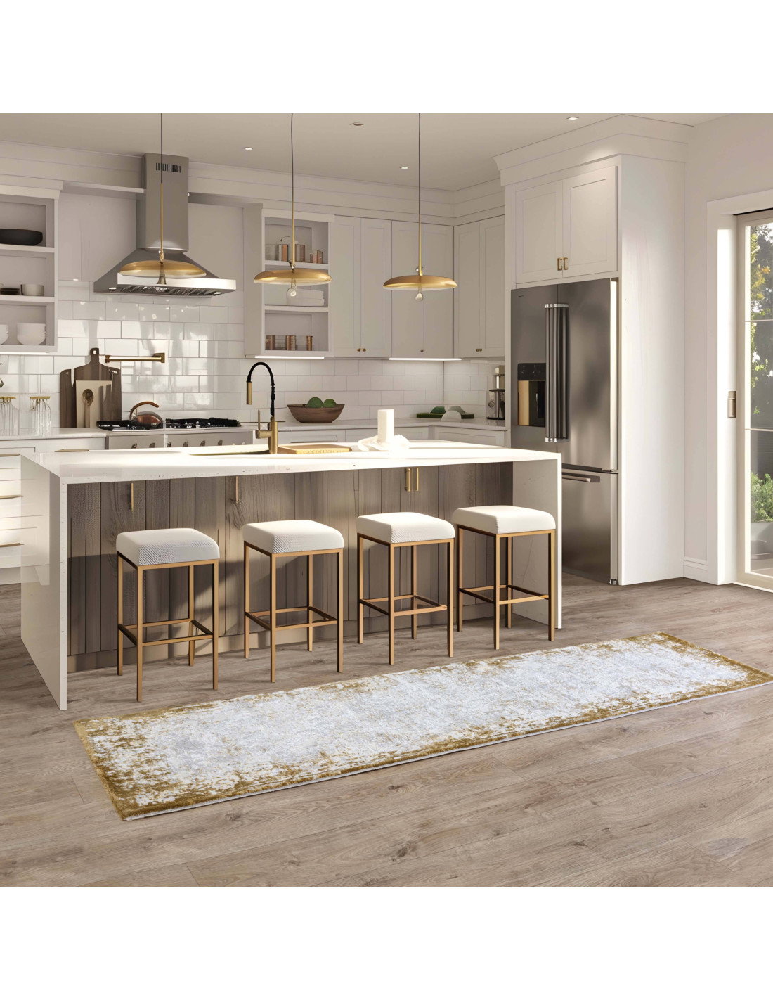 Il design minimalista ma ricercato, con la sua cornice dorata che incornicia un fondo chiaro, si adatta perfettamente a interni moderni ed eleganti, conferendo un tocco di classe senza appesantire l’ambiente. La manutenzione è semplice: basta un’aspirapolvere o un battitappeto per mantenerlo sempre pulito, mentre per un lavaggio più approfondito è consigliato rivolgersi a professionisti specializzati.