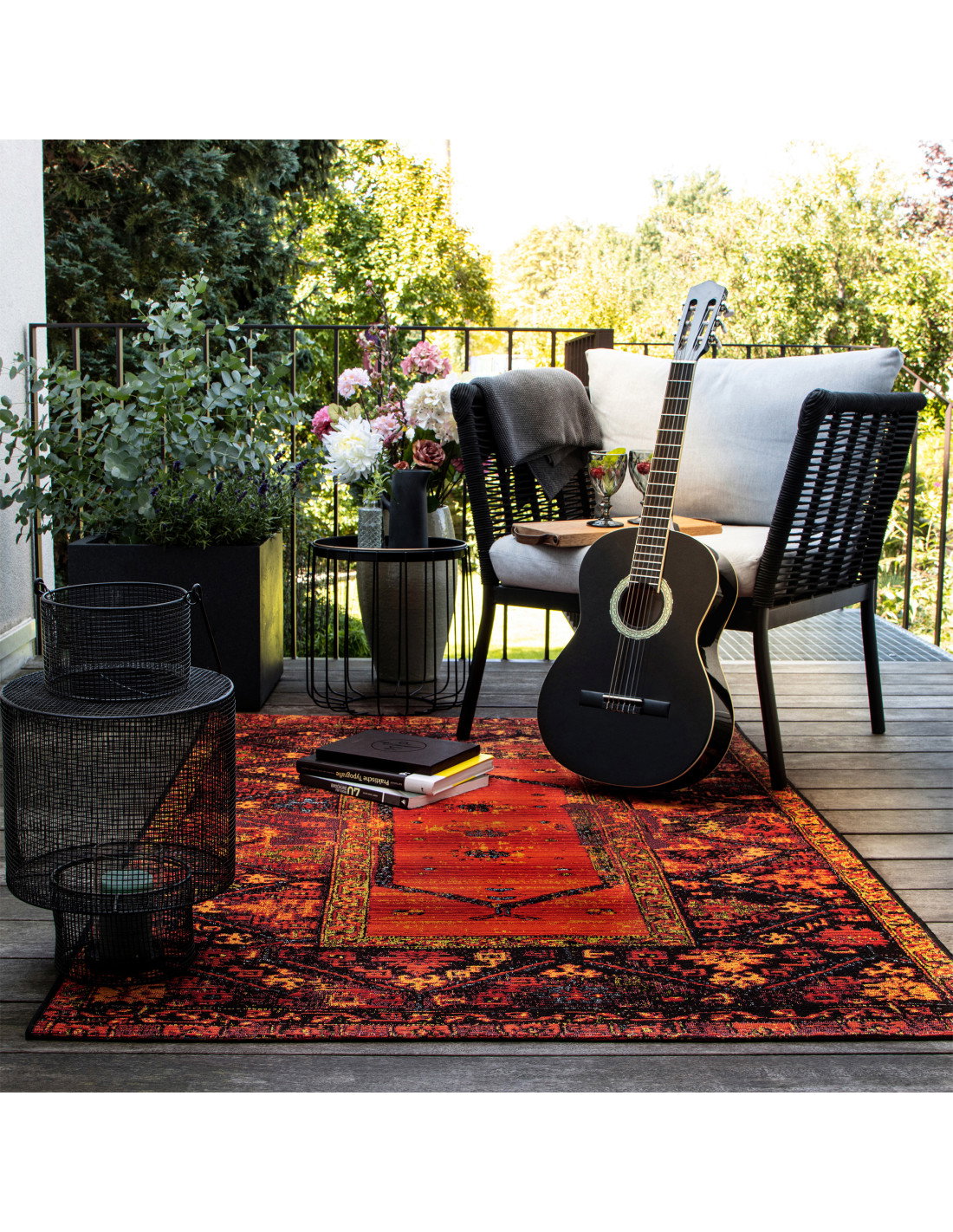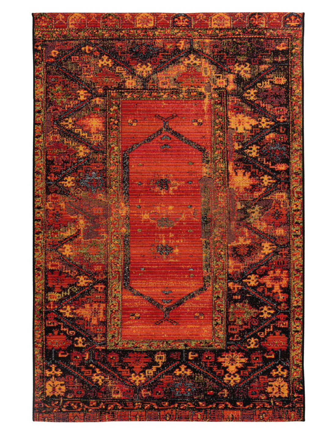 La combinazione di tonalità calde come il rosso, l’arancione e il giallo, mescolate a sfumature più scure di nero e verde, conferisce al tappeto un aspetto ricco e accogliente. Questi colori non solo catturano l’attenzione, ma si adattano facilmente a diversi stili di arredamento, dal rustico al moderno, valorizzando ogni spazio con un tocco di personalità. La trama meccanica, realizzata con tessuto a macchina, garantisce una superficie uniforme e resistente, perfetta per l’uso quotidiano.