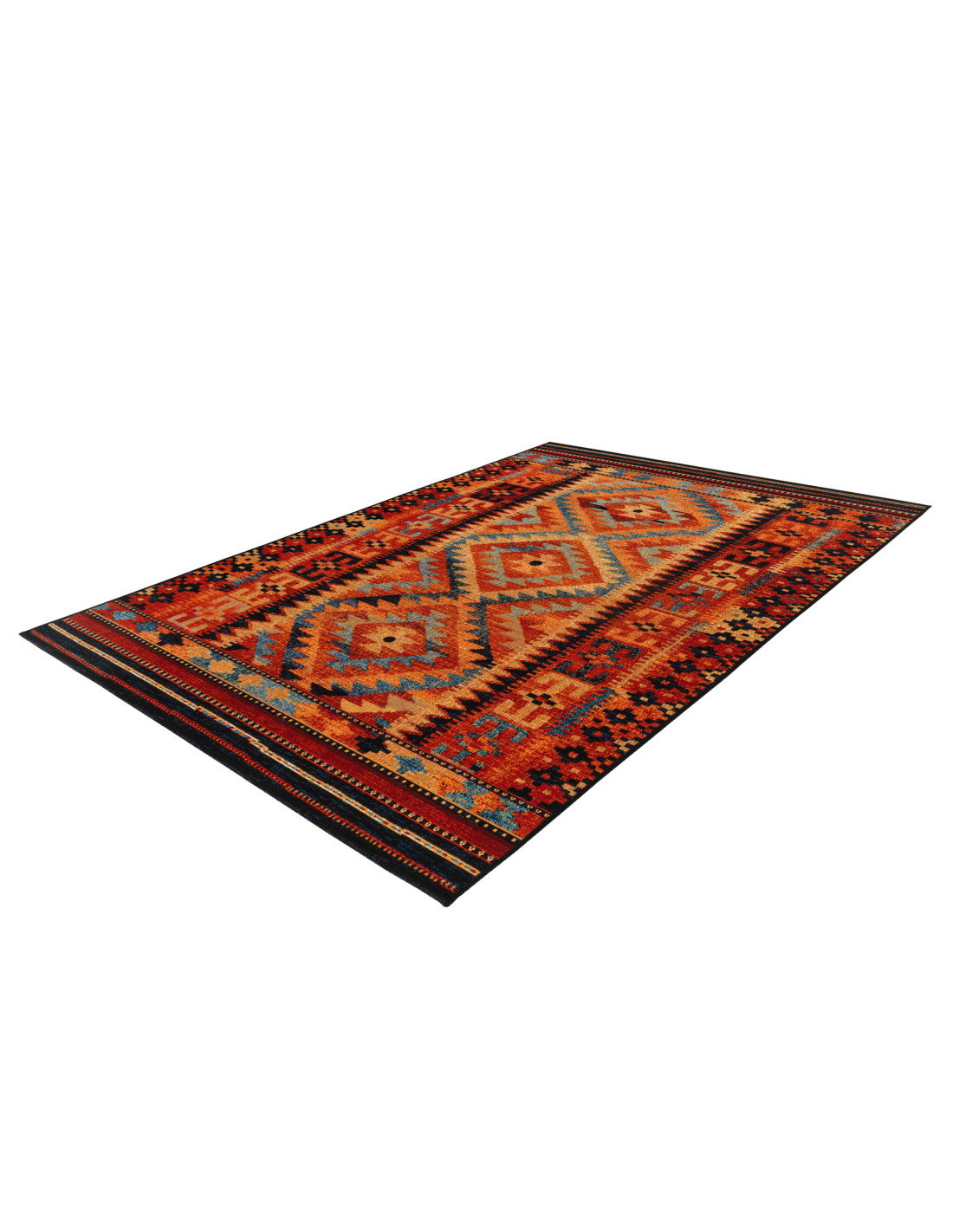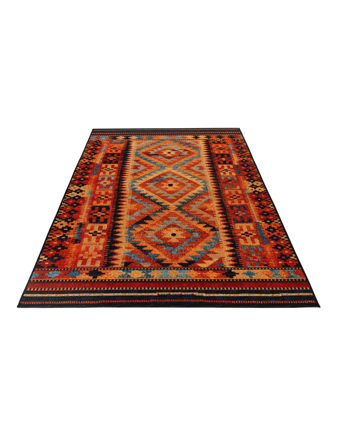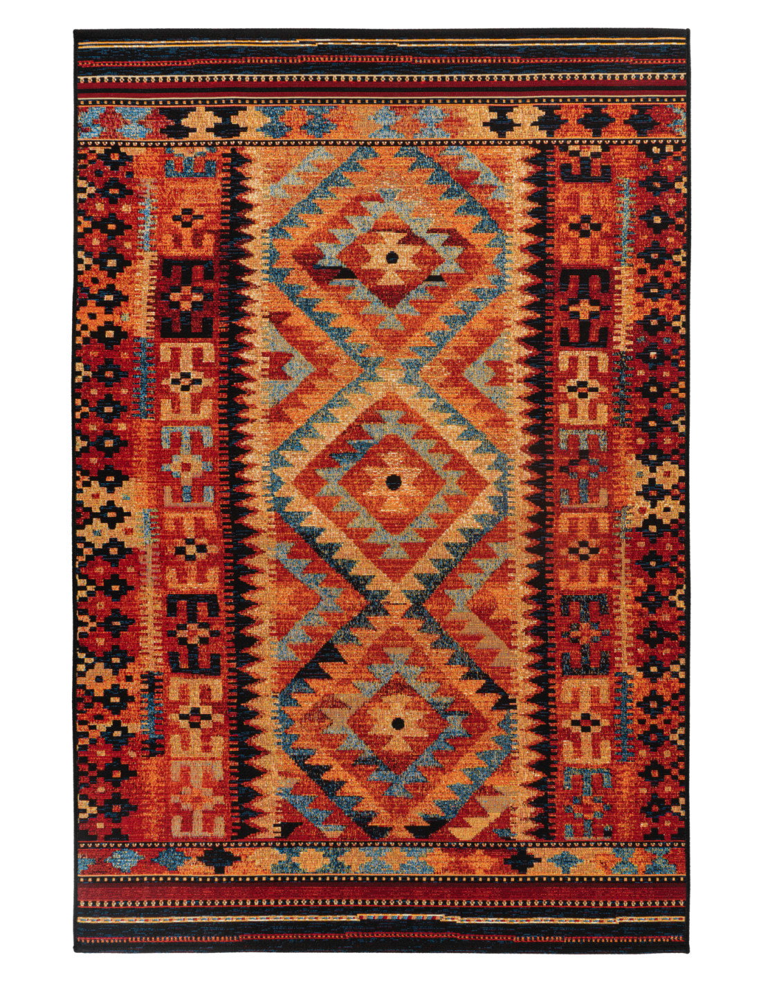Il tappeto Gobelina 641 multi è un vero capolavoro di stile classico reinterpretato con un tocco moderno, perfetto per chi desidera arricchire il proprio salotto con un elemento decorativo che unisce tradizione e vivacità cromatica. La sua trama meccanica, realizzata con tessuto a macchina, presenta un disegno geometrico ricco di dettagli, dove motivi a rombo e linee zigzag si intrecciano armoniosamente. I colori predominanti sono caldi e avvolgenti: sfumature di arancio, rosso, blu e beige si fondono creando un effetto visivo dinamico e accogliente, capace di trasformare qualsiasi ambiente in uno spazio elegante e confortevole.