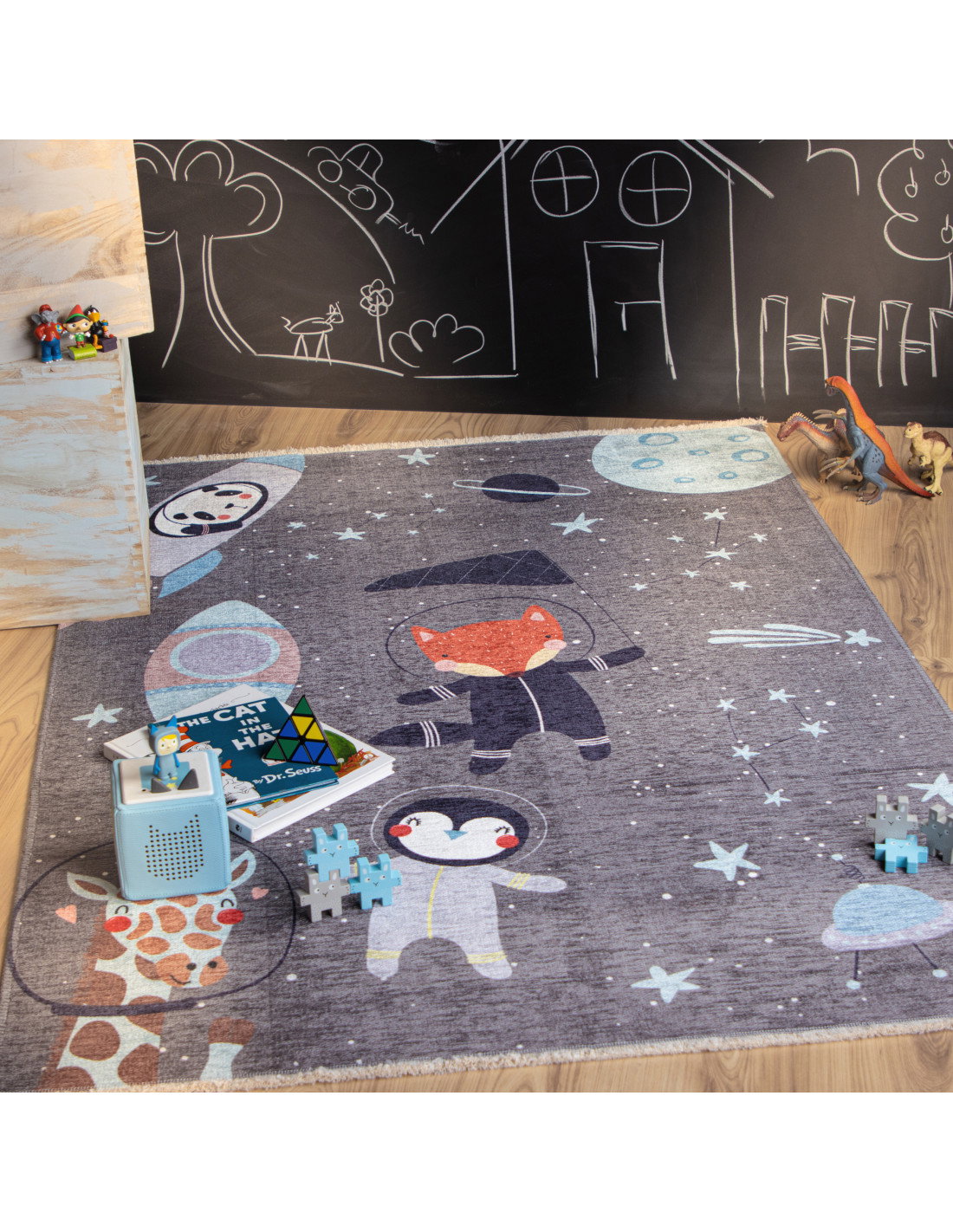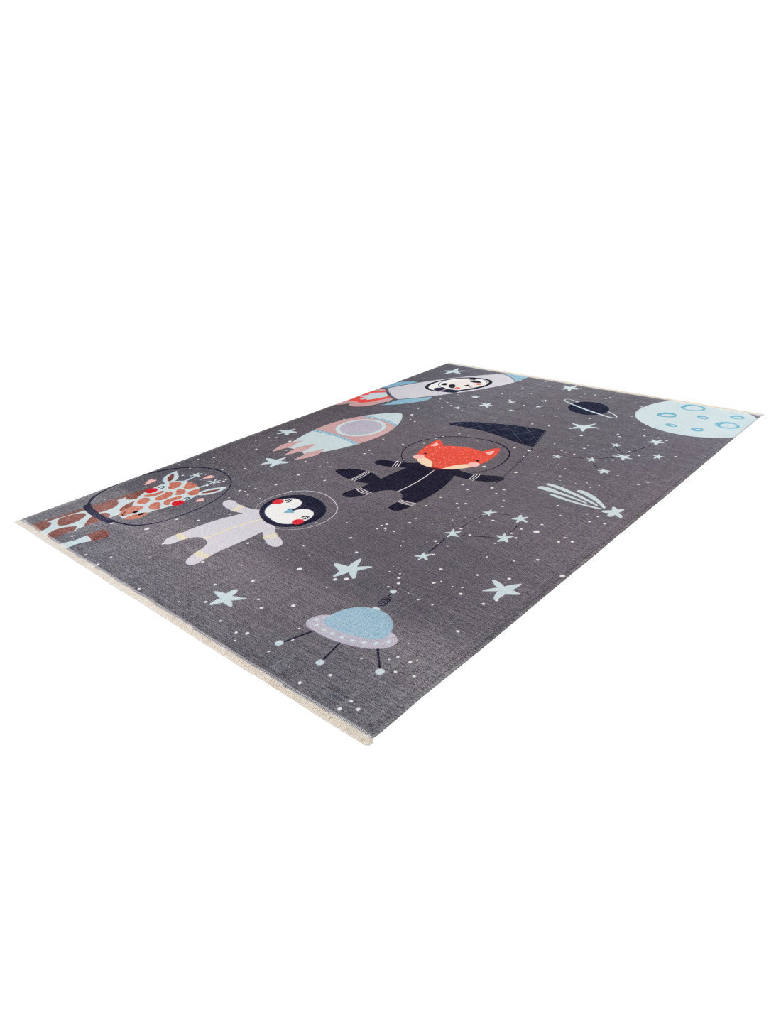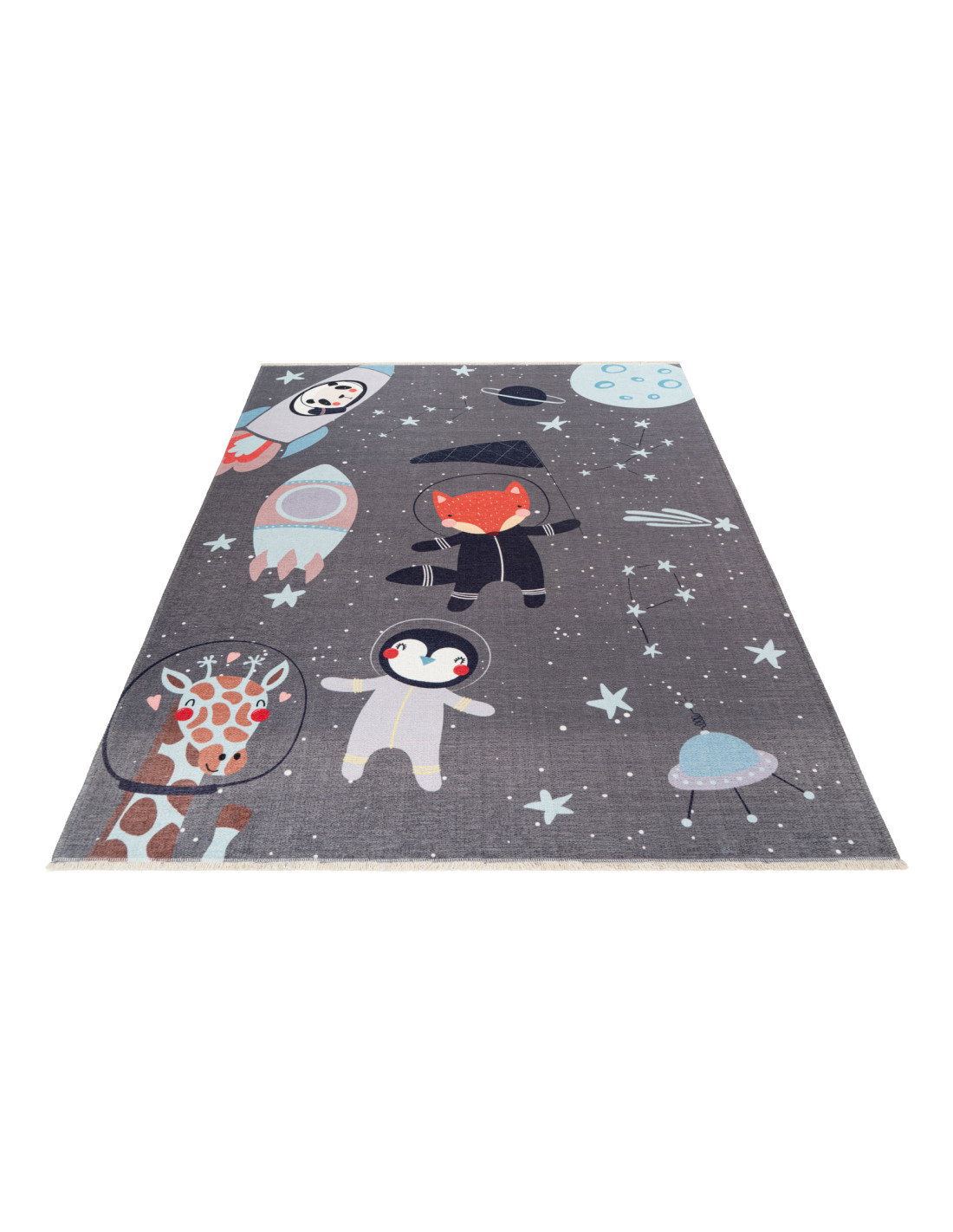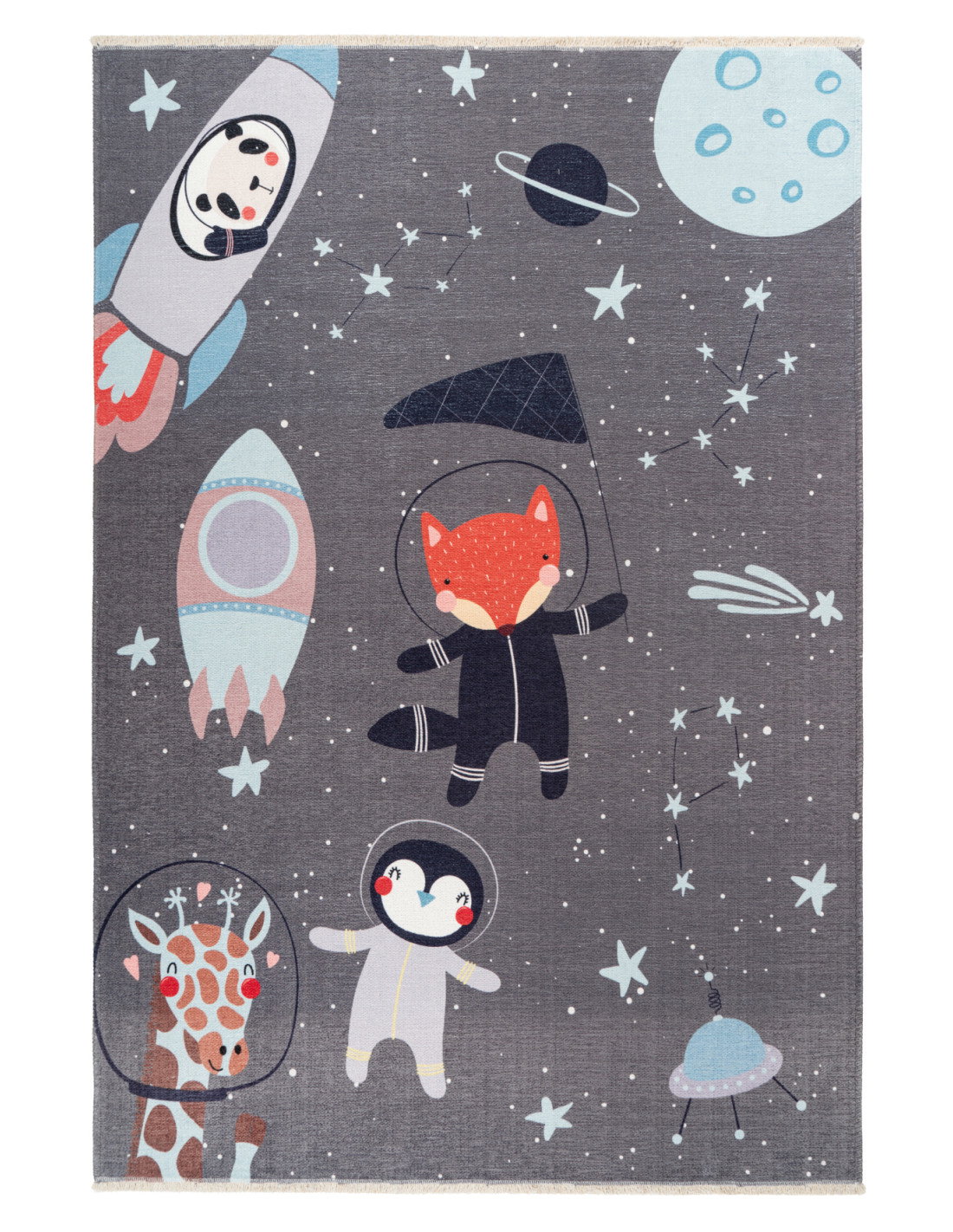 Il colore di base grigio scuro fa da sfondo perfetto per i dettagli vivaci: un panda in una navicella spaziale, una volpe con la tuta da astronauta, un pinguino e una giraffa con il casco spaziale. Questi elementi sono disegnati con linee morbide e colori pastello, come il celeste, il rosa tenue e il rosso acceso, che donano al tappeto un aspetto dolce e accogliente. Il contrasto tra il grigio e le tonalità più chiare rende il tappeto adatto anche a un arredamento moderno, senza risultare troppo infantile o eccessivamente colorato.