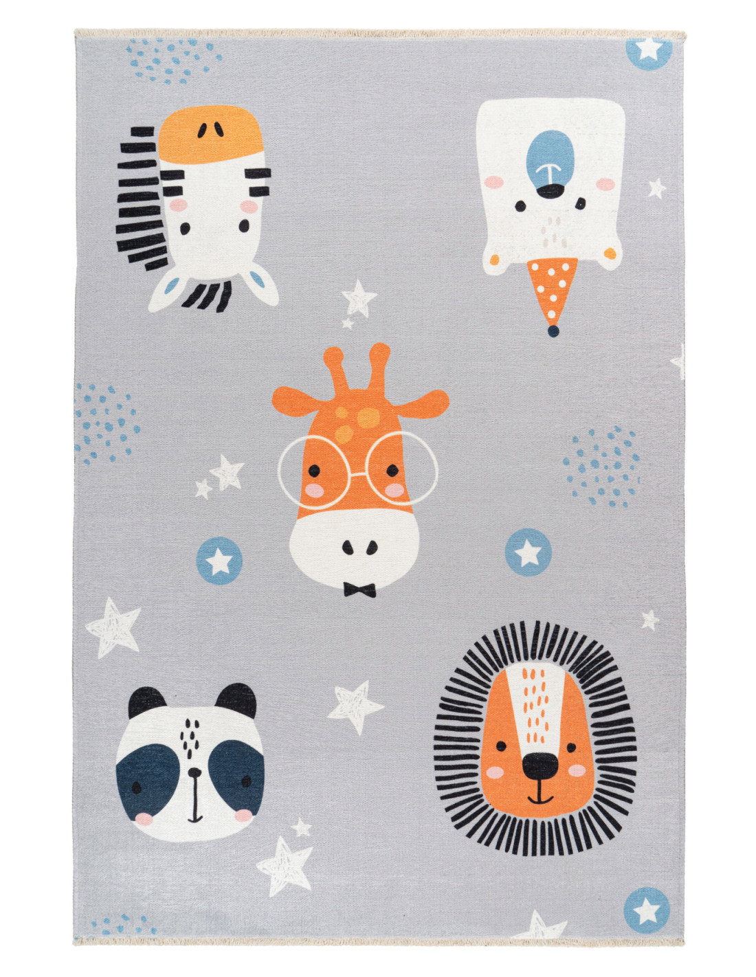 Il motivo centrale è una giraffa con occhiali rotondi e papillon, circondata da una zebra, un orso polare, un panda e un leone, tutti rappresentati con linee semplici e colori piatti, in uno stile che richiama l’animazione e il mondo dei cartoni. Le stelle bianche e i cerchi blu sparsi sul tappeto aggiungono un tocco di magia e movimento, rendendo questo tappeto un elemento decorativo che cattura l’attenzione e crea un’atmosfera giocosa e accogliente.