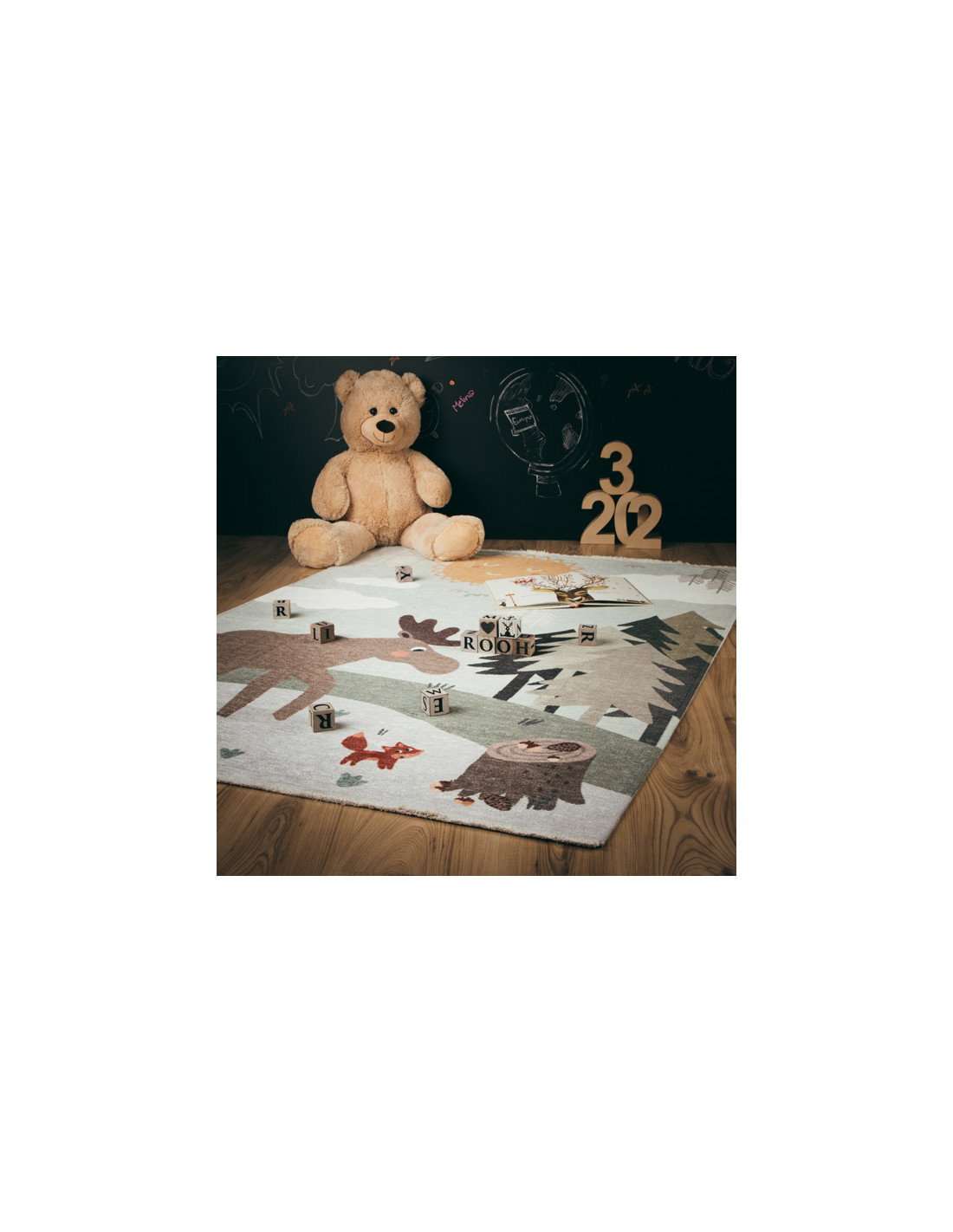 Il tappeto Greta 627 muschio è una scelta perfetta per chi desidera un tocco di allegria e natura negli ambienti dedicati ai più piccoli, senza rinunciare a uno stile moderno e raffinato. Questo tappeto moderno si distingue per il suo design giocoso e delicato, che ritrae una scena di bosco incantato con un grande alce marrone, una piccola volpe rossa, alberi stilizzati e un sole sorridente che illumina dolcemente il paesaggio. I colori predominanti sono tenui e naturali, con una base muschio che richiama la natura, accompagnata da sfumature di grigio chiaro, beige e tocchi di arancione e rosso, perfetti per stimolare la fantasia dei bambini senza risultare troppo invadenti.