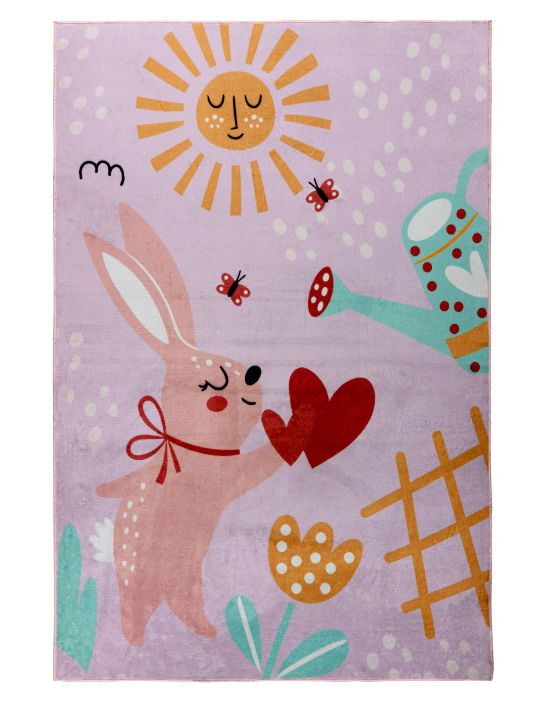 Il tappeto Magic Kids ML 106 Lora è una scelta perfetta per chi desidera un tocco di allegria e dolcezza negli ambienti dedicati ai più piccoli. Questo tappeto moderno, realizzato in 100% poliestere, si distingue per il suo design giocoso e colorato, capace di trasformare qualsiasi stanza in un luogo accogliente e stimolante. La base di colore lilla tenue crea un’atmosfera rilassante, mentre i dettagli vivaci come il coniglietto rosa con guanti a forma di cuore rossi, il sole sorridente e le farfalle rosse donano un senso di gioia e serenità.