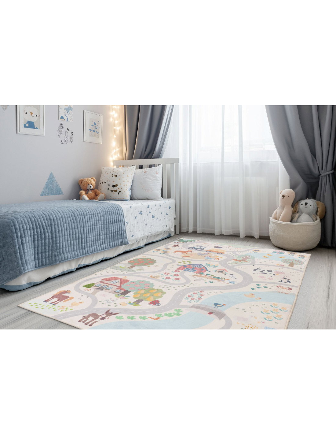 Il motivo raffigura un paesaggio rurale con strade tortuose, animali da fattoria come pecore, galline, mucche, cavalli e maiali, oltre a elementi naturali come alberi da frutto, fiori e un piccolo laghetto con anatroccoli. Questa rappresentazione non solo decora la stanza, ma diventa anche un gioco educativo per i bambini, che possono imparare a riconoscere gli animali e gli elementi della natura mentre giocano sul tappeto.