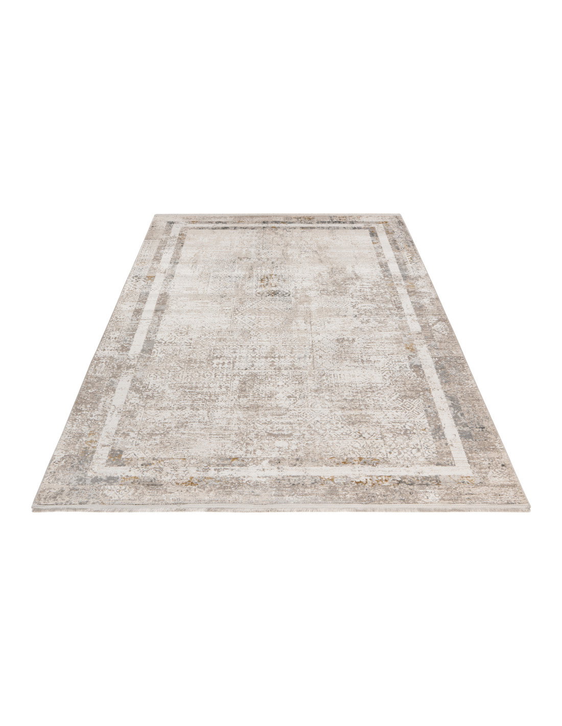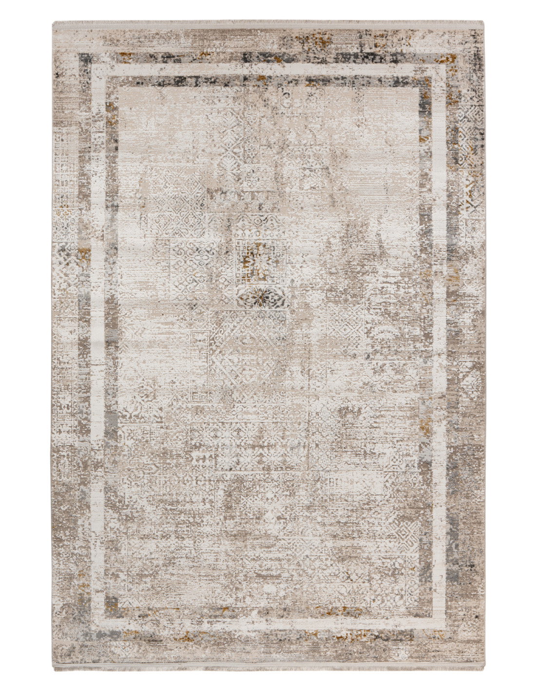 Il motivo decorativo, leggermente sbiadito e dall’aspetto vissuto, richiama i tappeti antichi ma con una lavorazione meccanica all’avanguardia che garantisce precisione e uniformità. Questo design vintage, arricchito da dettagli geometrici e floreali appena accennati, dona profondità e movimento alla superficie, evitando l’effetto piatto e monotono. La doppia cornice che incornicia il tappeto aggiunge un senso di ordine e struttura, rendendolo ideale per valorizzare il salotto o qualsiasi spazio living.