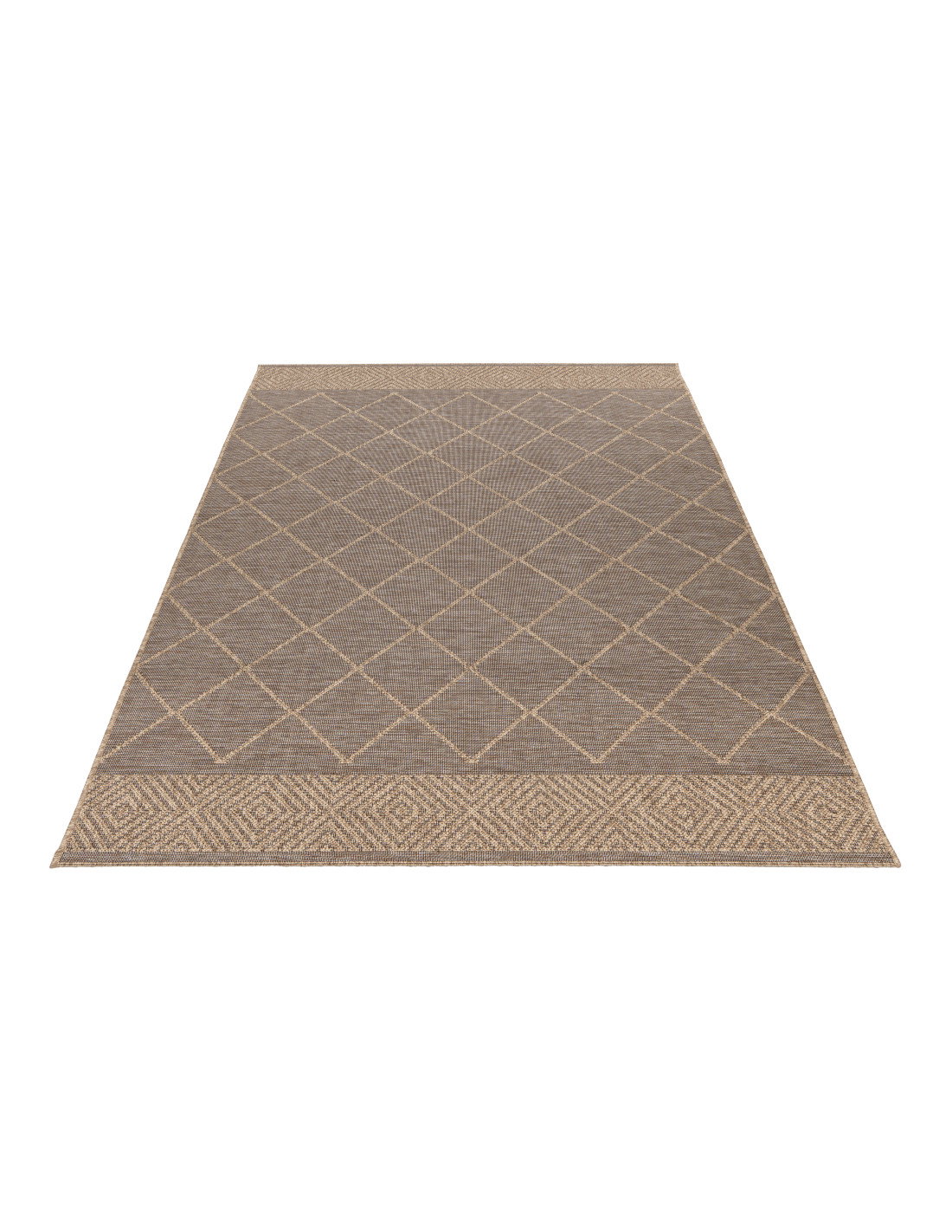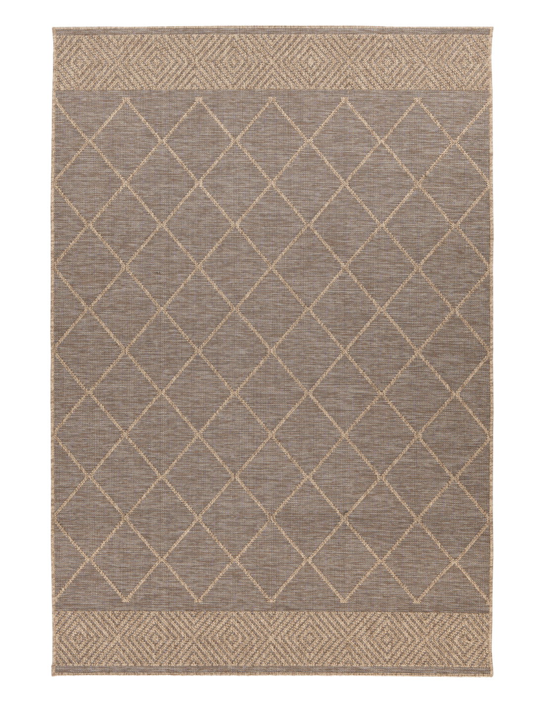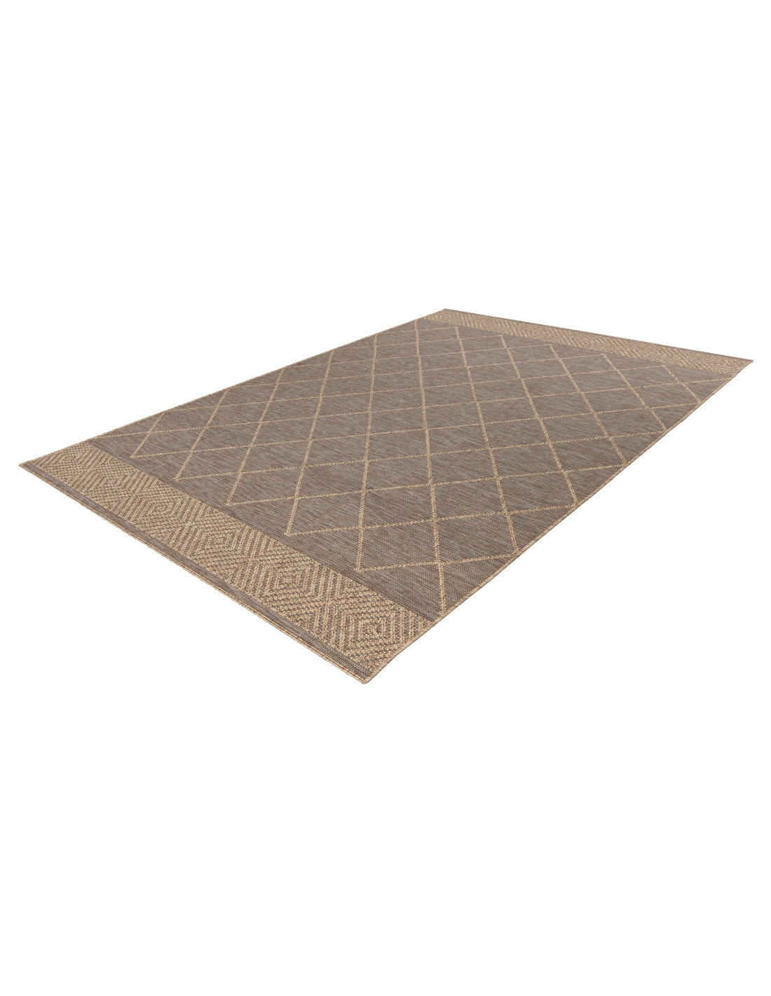 La tonalità tortora, neutra e versatile, si adatta facilmente a qualsiasi palette di colori, rendendo questo tappeto un complemento d’arredo capace di integrarsi con mobili in legno chiaro, metallo o tessuti dai toni caldi e freddi. La bordatura superiore e inferiore presenta un motivo a intreccio più fitto, che aggiunge un dettaglio di carattere senza appesantire l’insieme, conferendo equilibrio e stile.