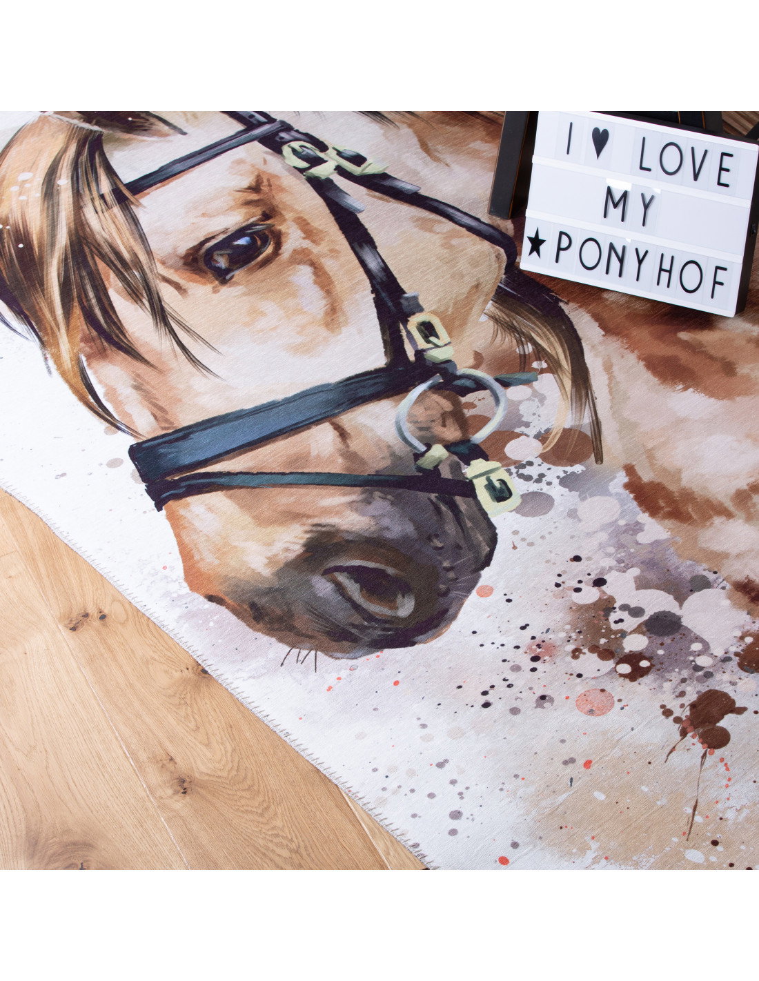 Il tappeto Torino Kids 236 bellezza bruna è un vero capolavoro di design moderno pensato per arricchire con stile e calore gli spazi dedicati ai più piccoli. La sua immagine protagonista, un elegante cavallo dal manto bruno sfumato, è resa con una tecnica pittorica che ricorda un’acquerellatura, dove le sfumature di marrone, beige e tocchi di nero si fondono armoniosamente creando un effetto dinamico e naturale. Questo motivo artistico, arricchito da schizzi di colore che sembrano quasi spruzzi di vernice, dona al tappeto un carattere unico e contemporaneo, perfetto per chi cerca tappeti moderni con un tocco di originalità.