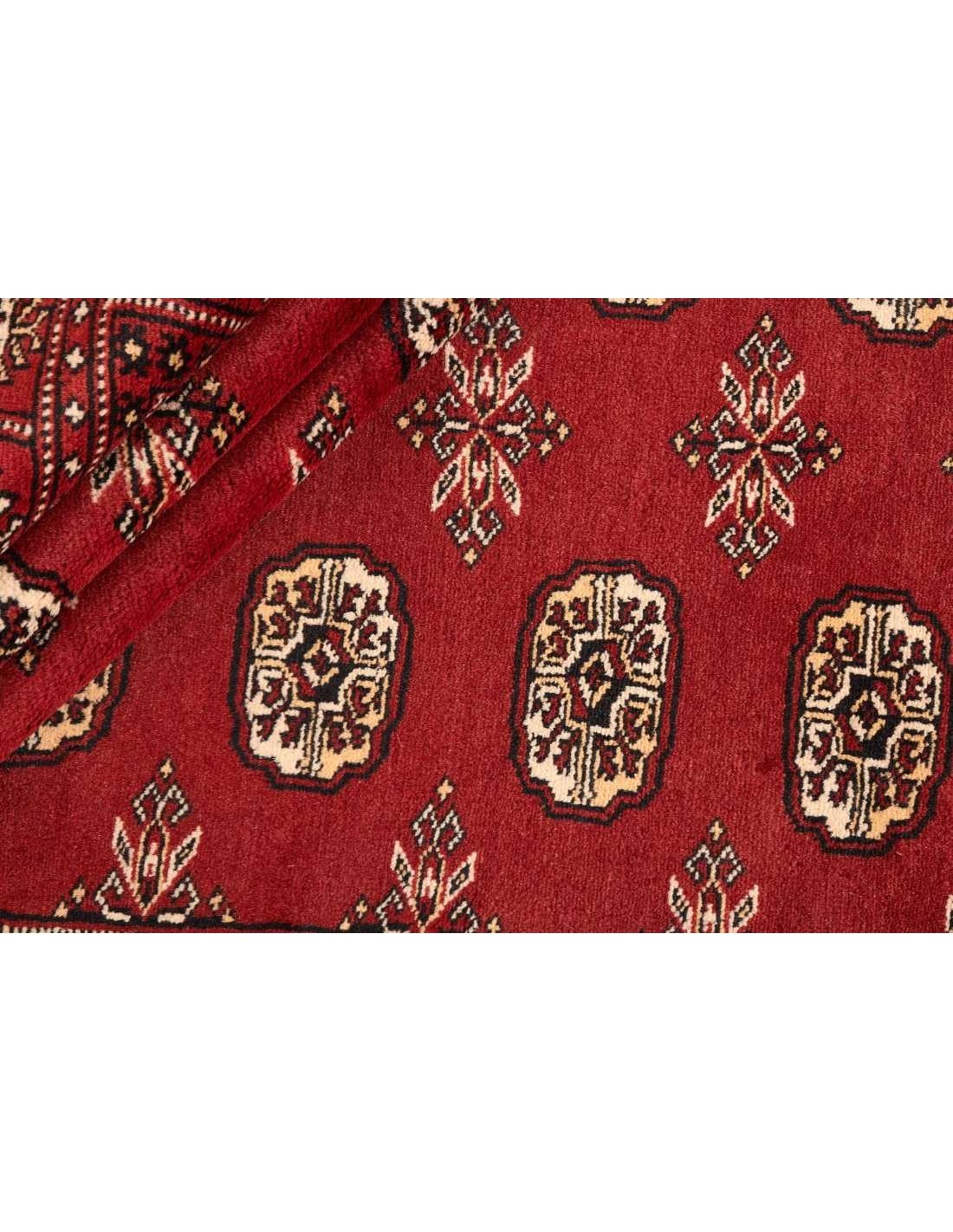 Questi tappeti sono noti per i loro motivi geometrici, che spesso includono ripetizioni di elementi come guls (medaglioni ottagonali o a forma di diamante) o intricati intrecci di forme geometriche più piccole. I tappeti Bukhara sono tradizionalmente annodati a mano utilizzando lana morbida e di alta qualità, il che contribuisce alla loro texture soffice e lussuosa.