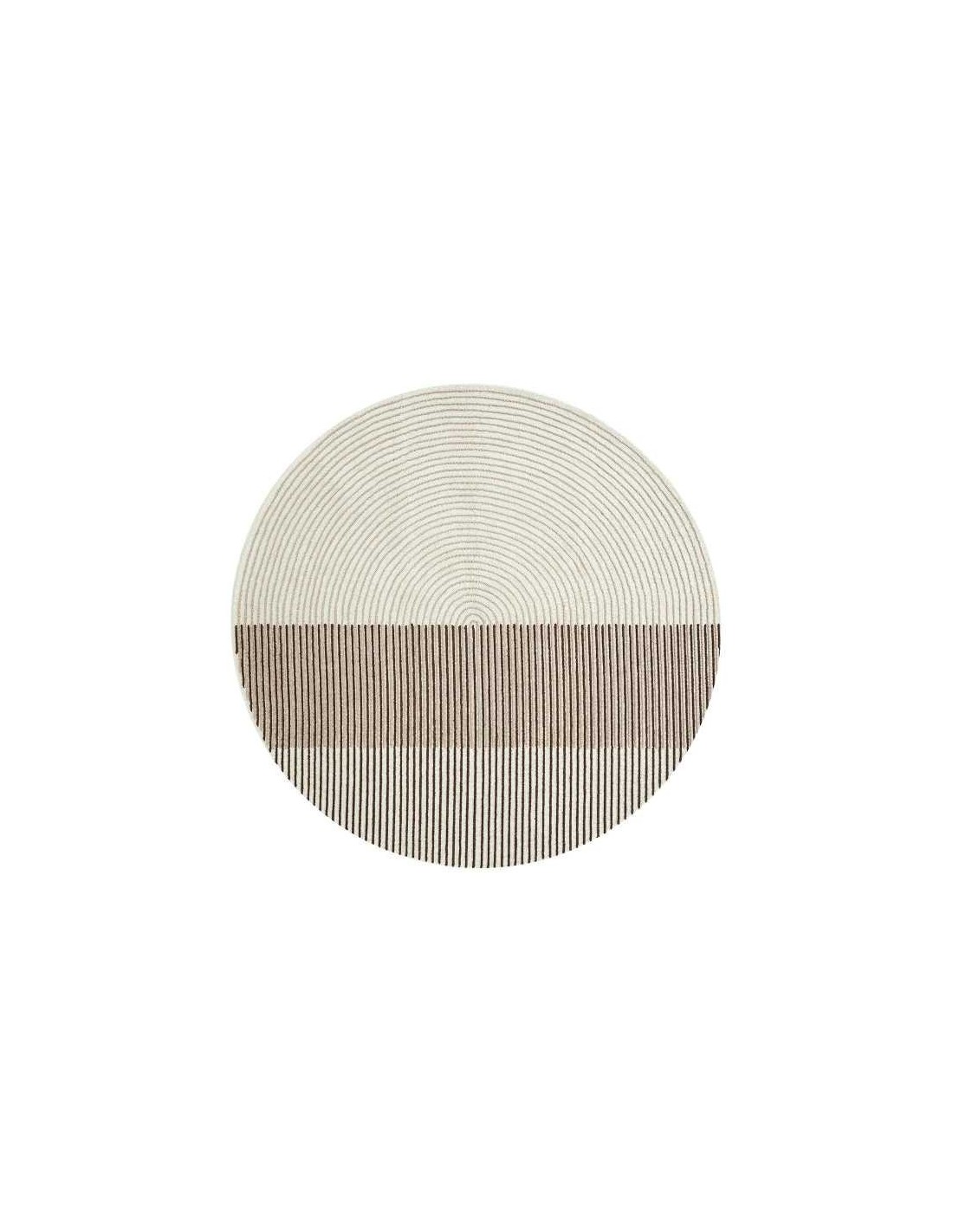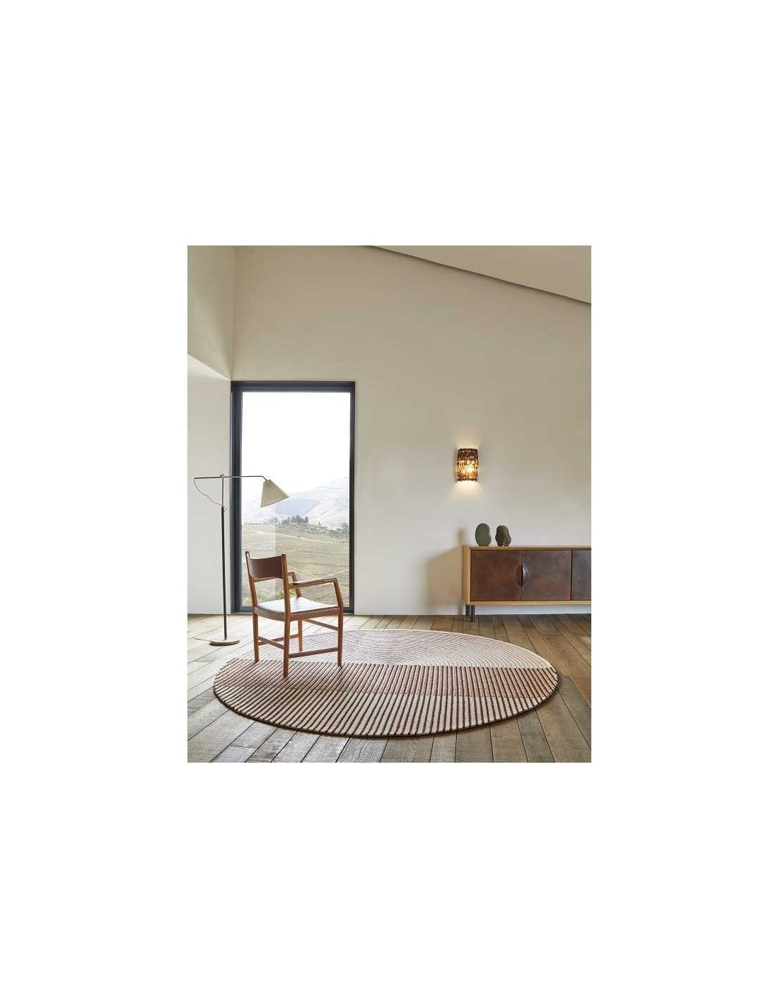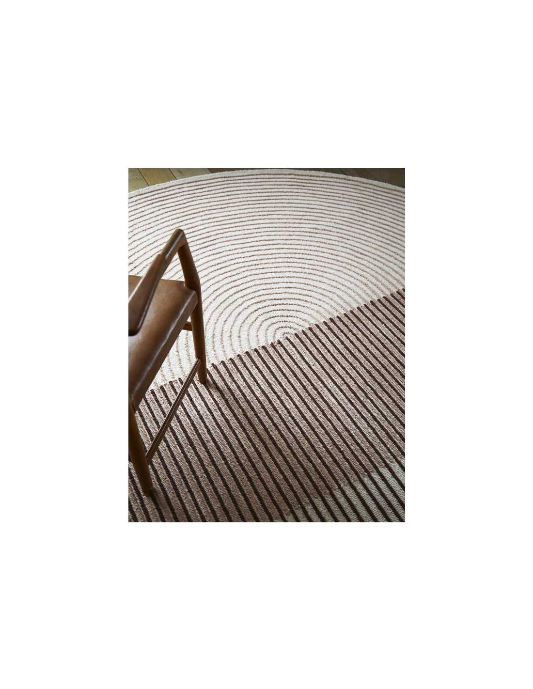 Questo è il modello rosa della serie di tappeti moderni Ply, un tappeto rotondo con un design impressionante e ipnotico concepito da Mut Design Studio. Il suo modello è costruito, tuttavia, in un modo molto semplice, combinando tre toni e due texture diverse: una piatta in un tono neutro per la base, e un altro in rosa che loop le linee rosa e marrone rosse, con più volume.