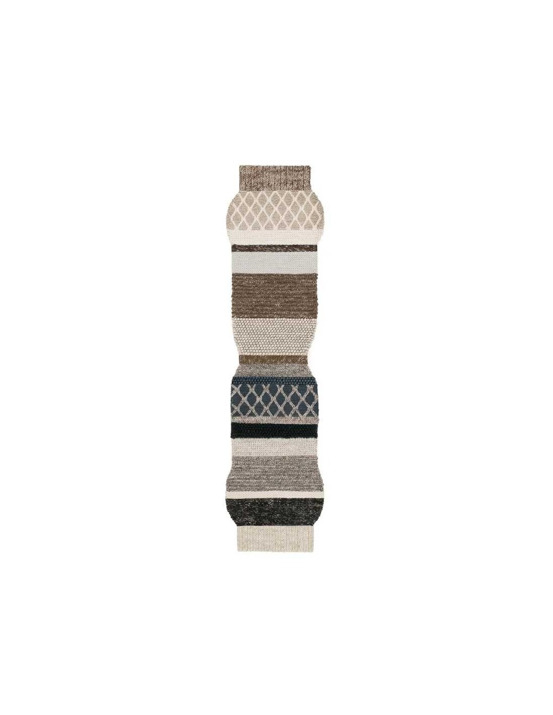 Un lungo tappeto moderno con 18 diversi modelli e trame nel suo design. Questo è il modello Largas ML1N Natural della collezione Original Mangas, uno dei più grandi pezzi della serie, tessuta nella sua interezza su un telaio manuale con fili di lana voluminosa e una ricca varietà di colori naturali. Può essere utilizzato in combinazione con i mini modelli di questa collezione per creare una composizione ancora più lunga. La sua forma ricorda la manica di un maglione invernale ("mangas" significa manica in spagnolo).