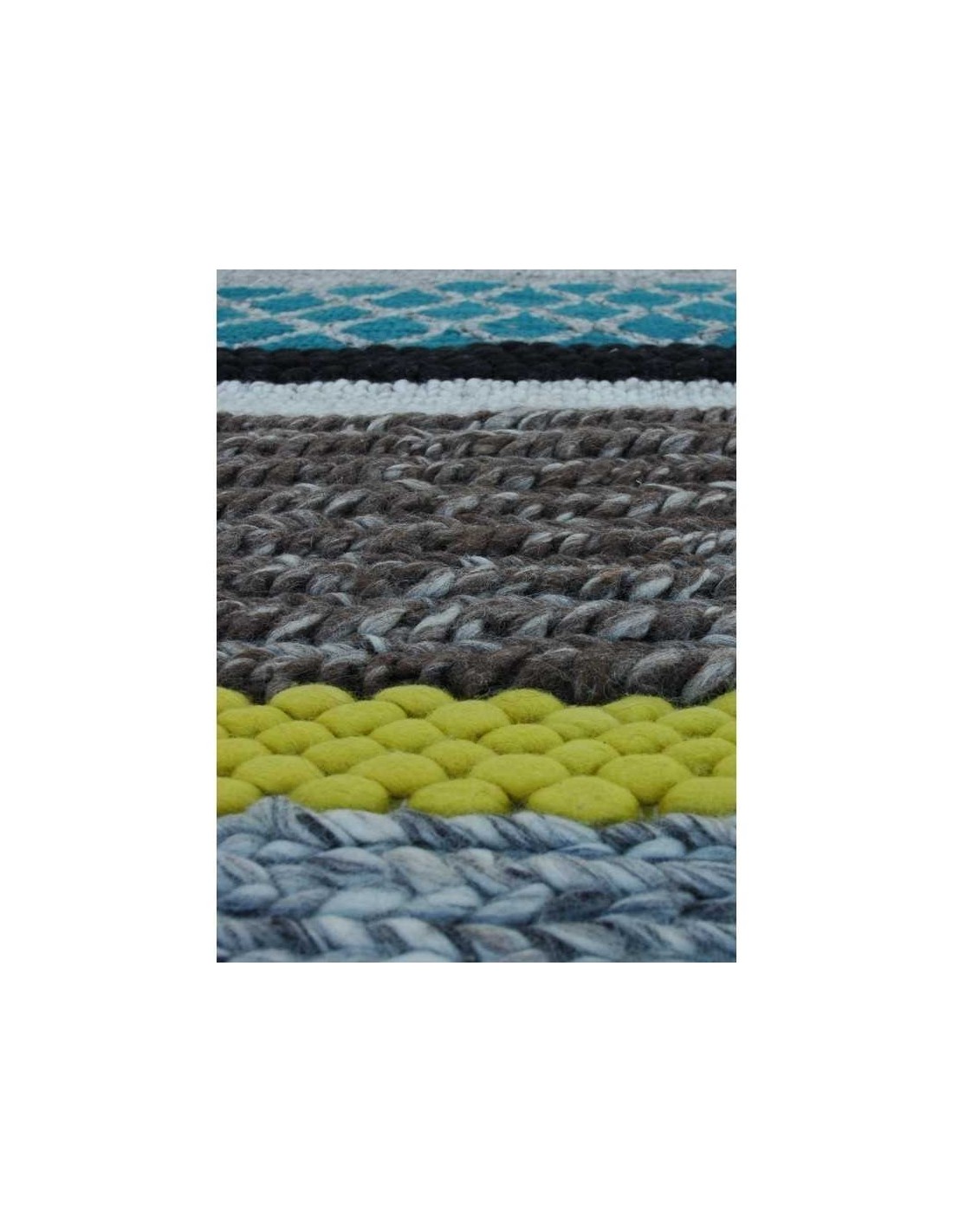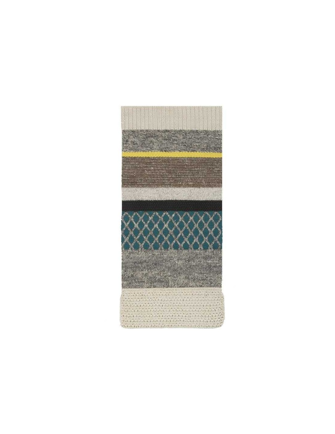 Questo è il modello Rectangular MR1 dalla collezione originale di Mangas, un tappeto moderno che combina nove diverse trame e disegni disposti come strisce, ciascuna fatta con diverse sfumature di tipi di lana e maglia. È disponibile in due dimensioni e il suo formato è rettangolare ma leggermente arrotondato da un lato. Combina i toni della Terra con un paio di note di colore in giallo e turchese.